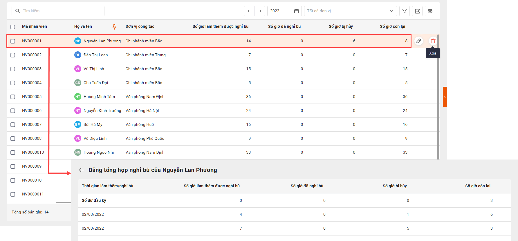 – Để sửa số giờ làm thêm được nghỉ bù, số giờ bị hủy phát sinh trong kỳ, anh chị click vào dòng thông tin của nhân viên để sửa trong chi tiết nghỉ bù.
