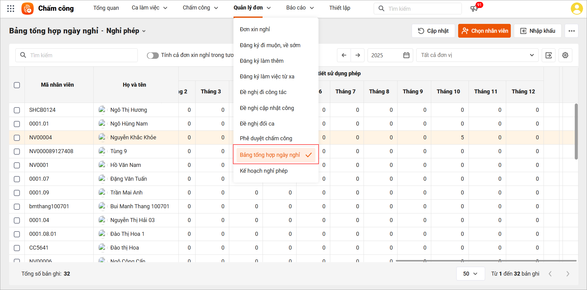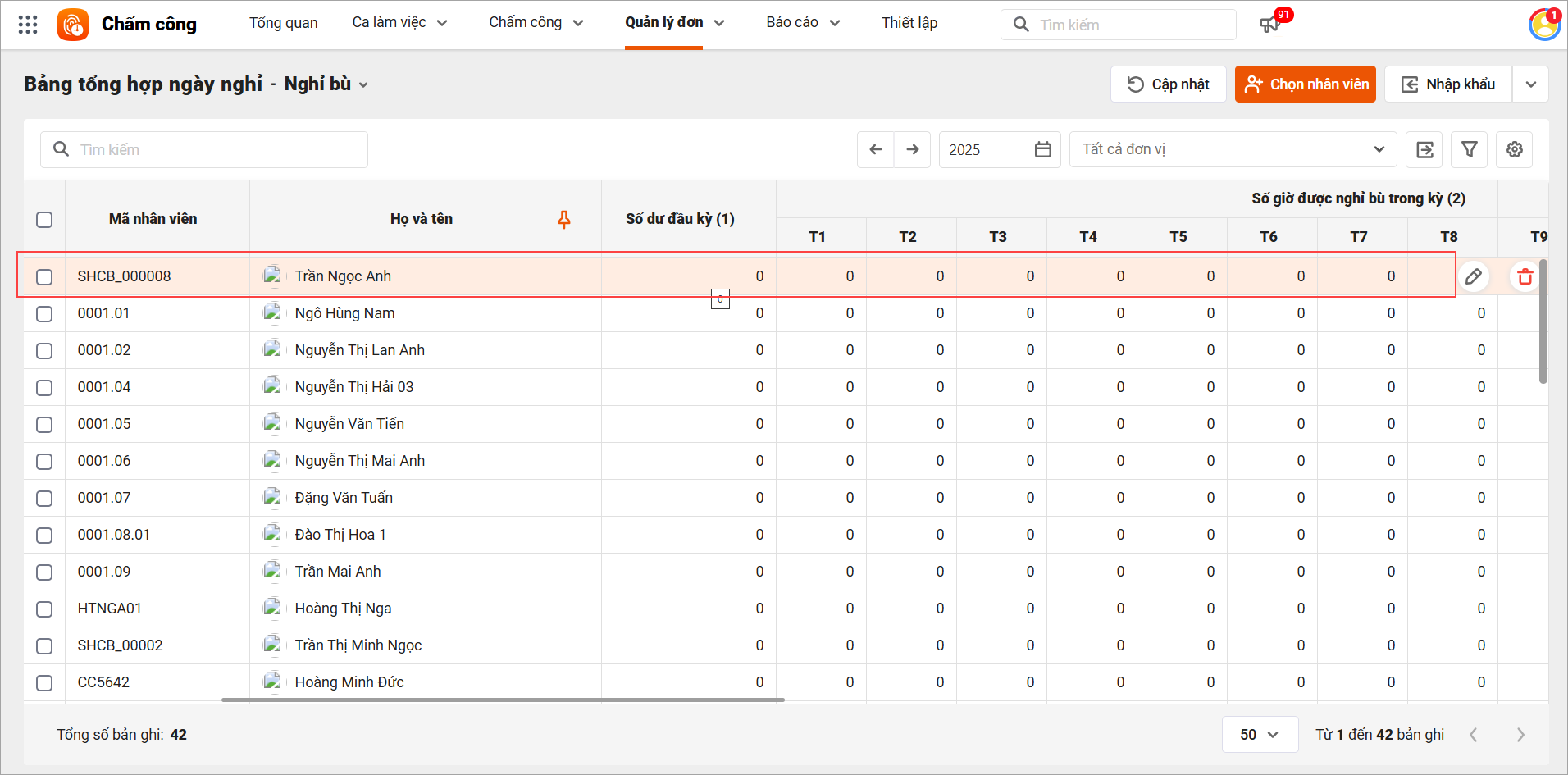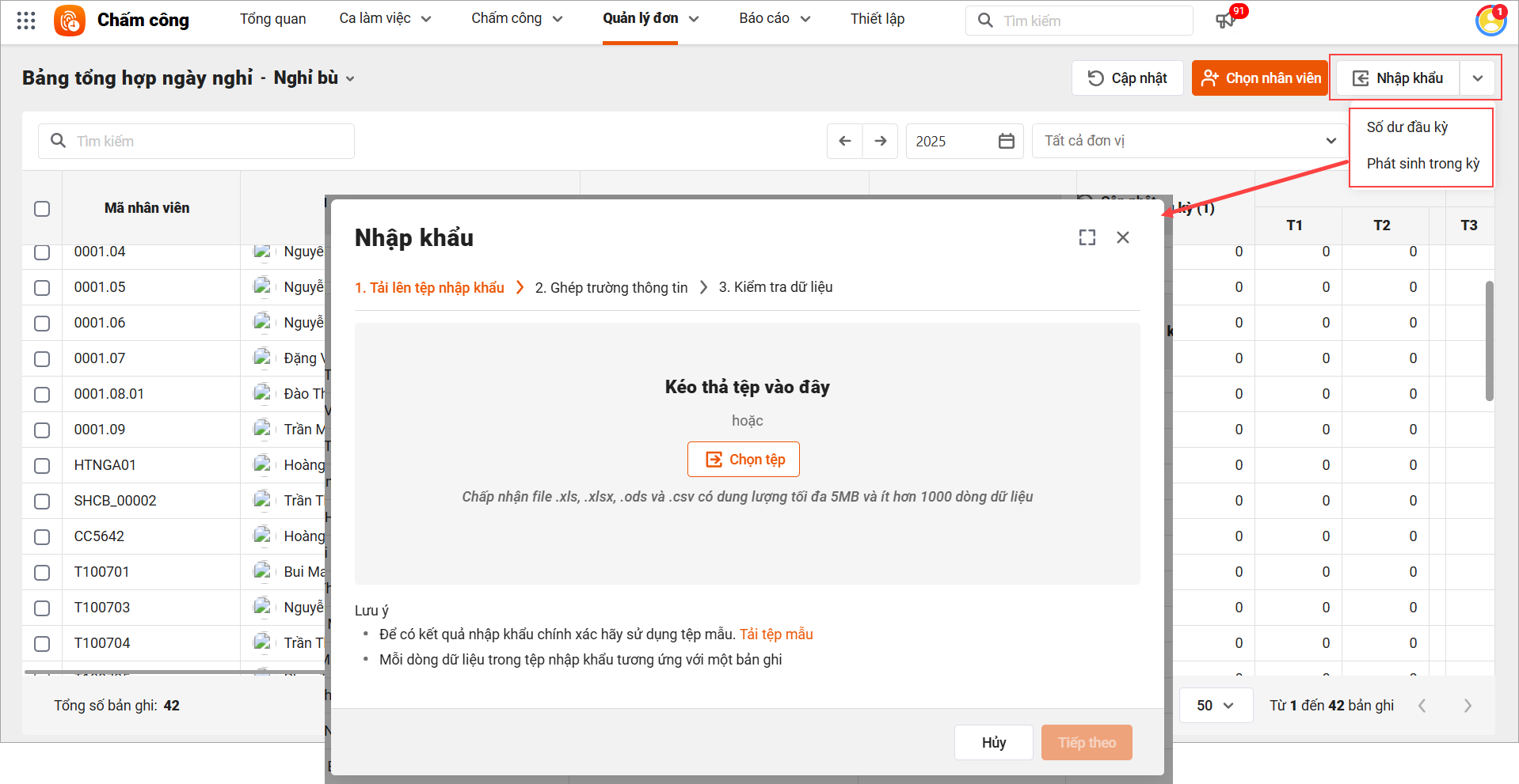 Trường hợp 1: Ghi nhận nhanh quỹ nghỉ bù còn tồn/phát sinh trong kỳ của CBNV lên phần mềm