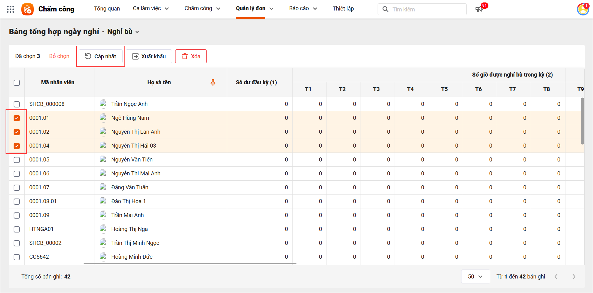 Trường hợp 3: Khi Cán bộ/quản lý vừa duyệt đơn làm thêm/nghỉ bù cho CBNV, cần lấy số liệu mới nhất lên bảng, anh chị nhấn “Cập nhật“. Tính năng này đáp ứng cho dữ liệu cả bảng hoặc tích chọn từng CBNV.