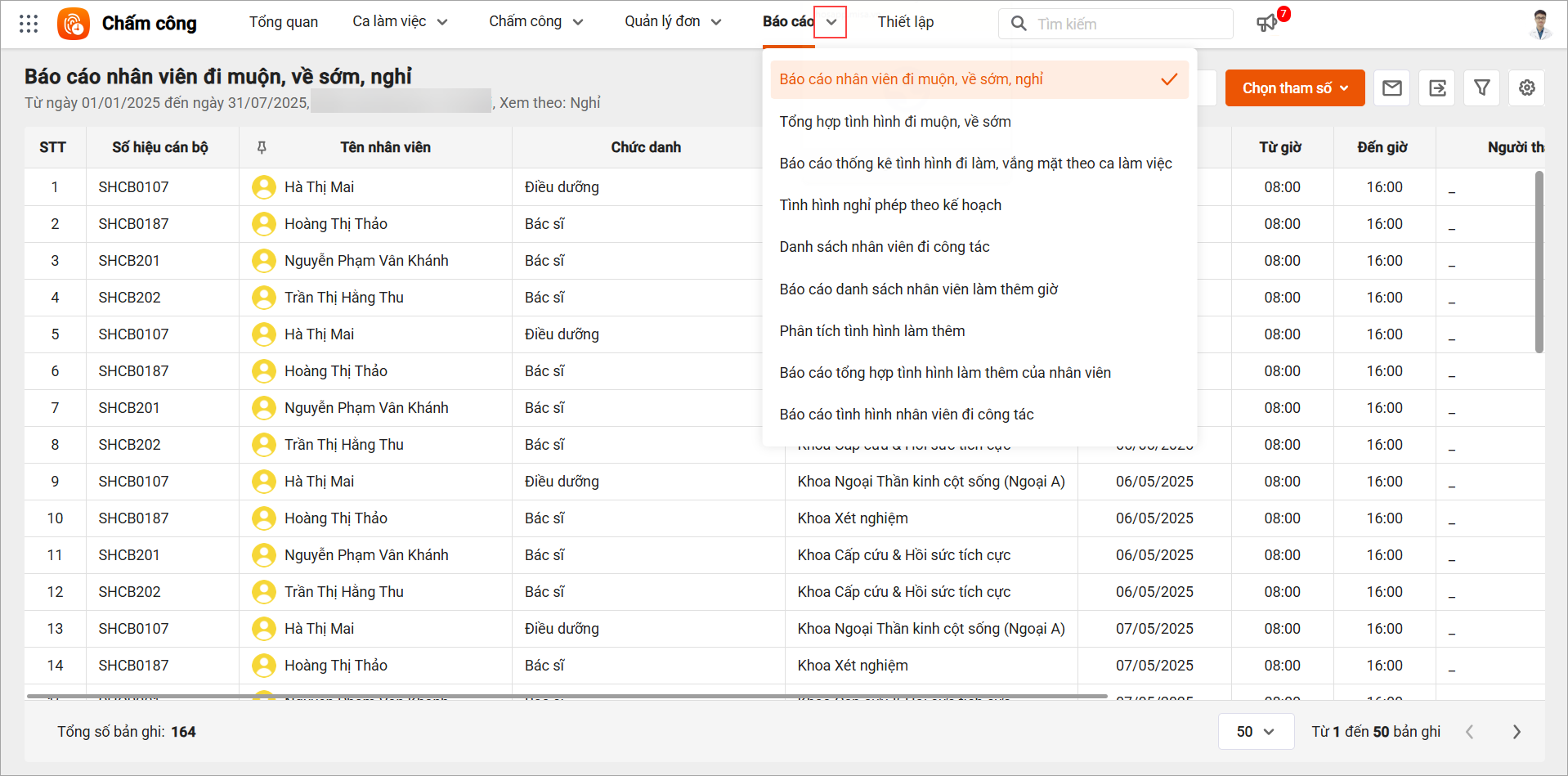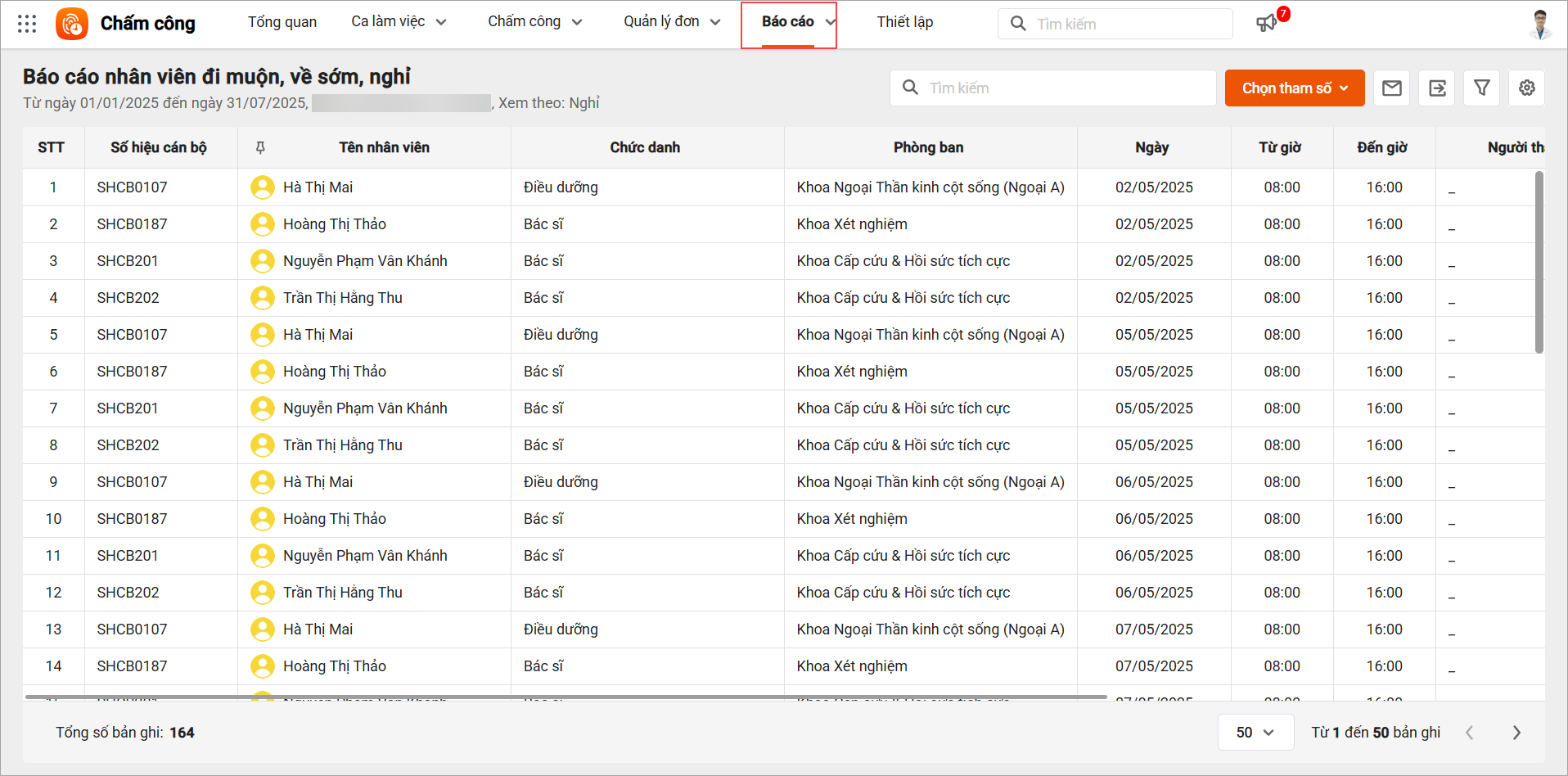 | Báo cáo nhân viên đi muộn, về sớm, nghỉ | Thống kê từng lần đi muộn, về sớm, nghỉ của mỗi nhân viên trong kỳ báo cáo |