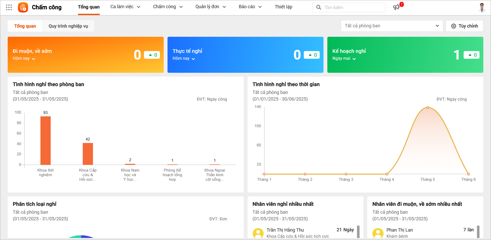 6 Tình hình đi muộn, về sớm theo phòng ban Thống kê số lần, số phút đi muộn/về sớm nhân viên nghỉ từ bảng chấm công chi tiết và nhóm theo từng phòng ban/đơn vị Giúp Cán bộ/quản lý nắm bắt được phòng ban nào có nhân viên đi muộn/về sớm nhiều để đánh giá tình hình tuân thủ nội quy của từng phòng ban/đơn vị