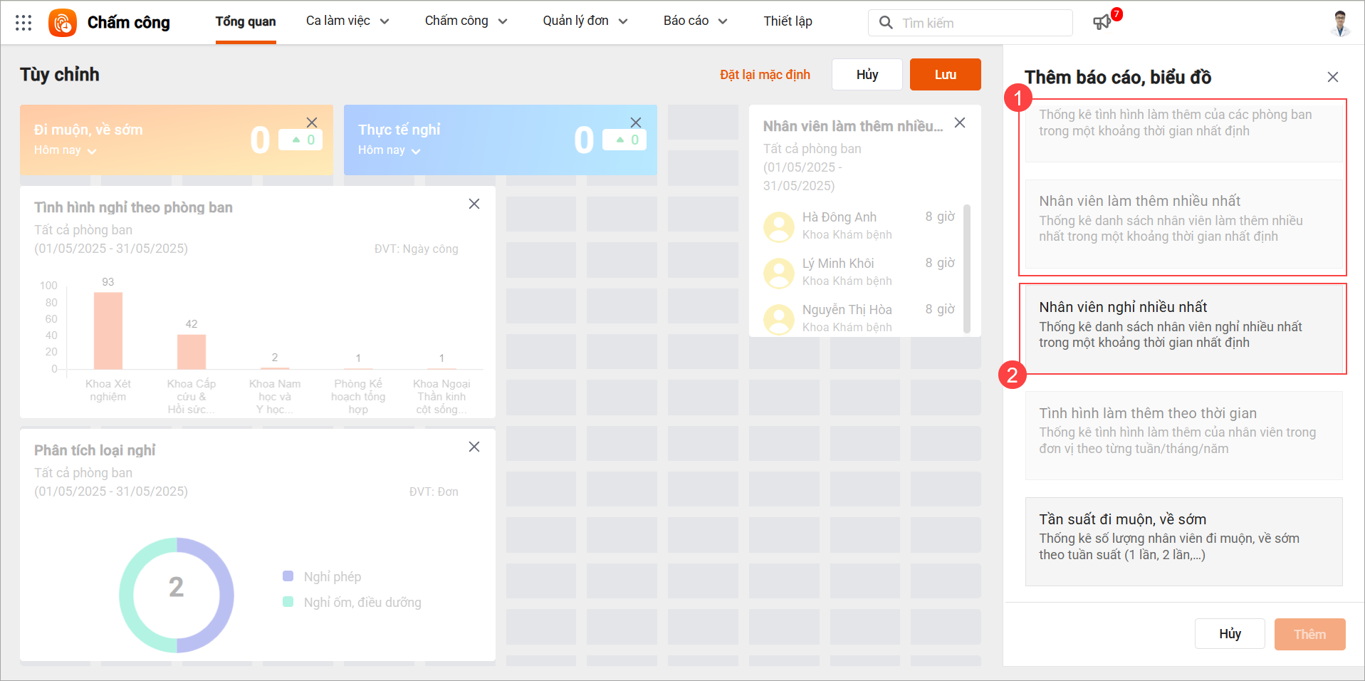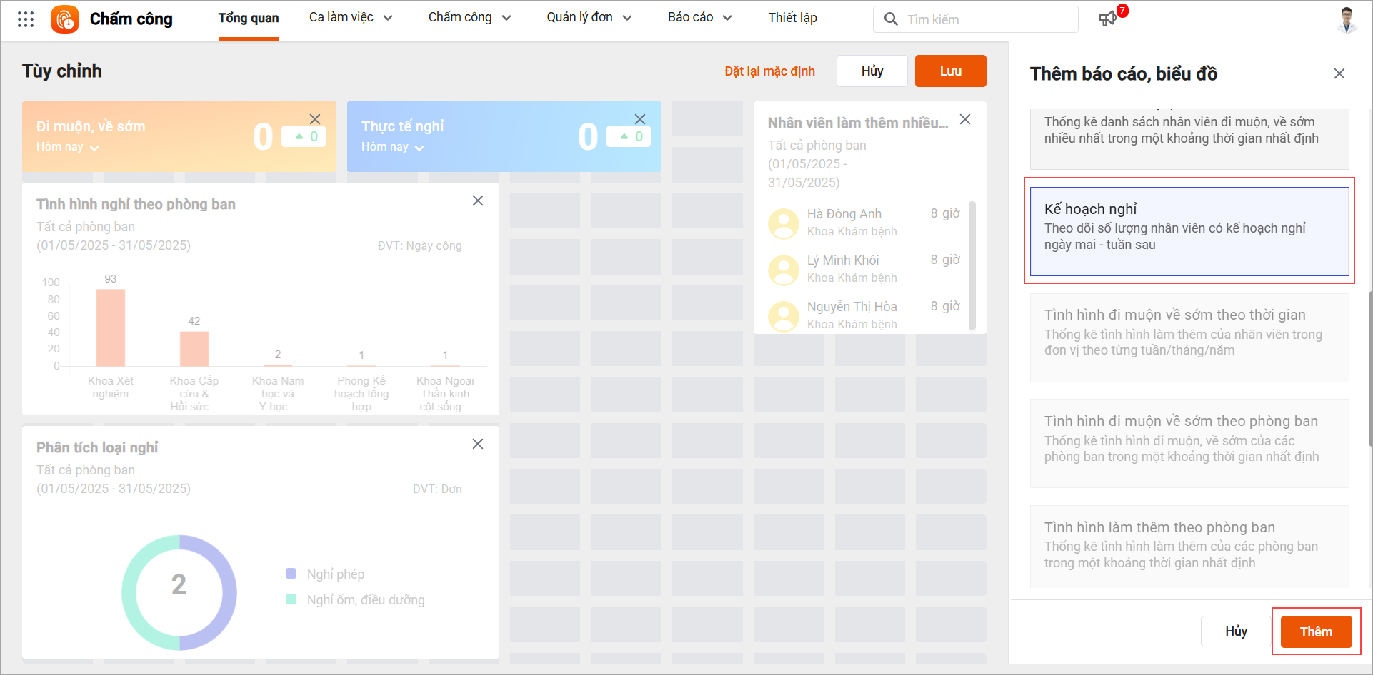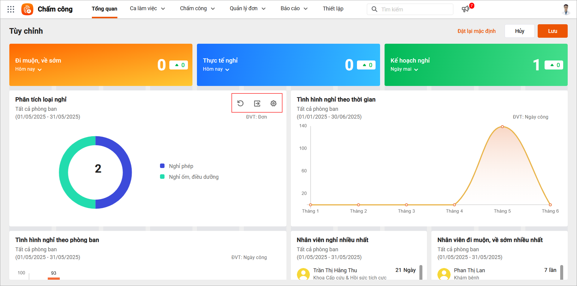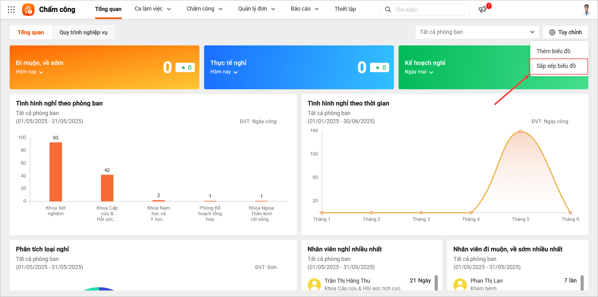 Tại phân hệ Tổng quan: Cán bộ xem đươcác biểu đồ thống kê về tình hình nghỉ, đi muộn/về sớm, làm thêm của nhân viên và cho phép tùy chỉnh thứ tự hiển thị, ẩn/hiện biểu đồ theo nhu cầu cá nhân của từng người dùng.