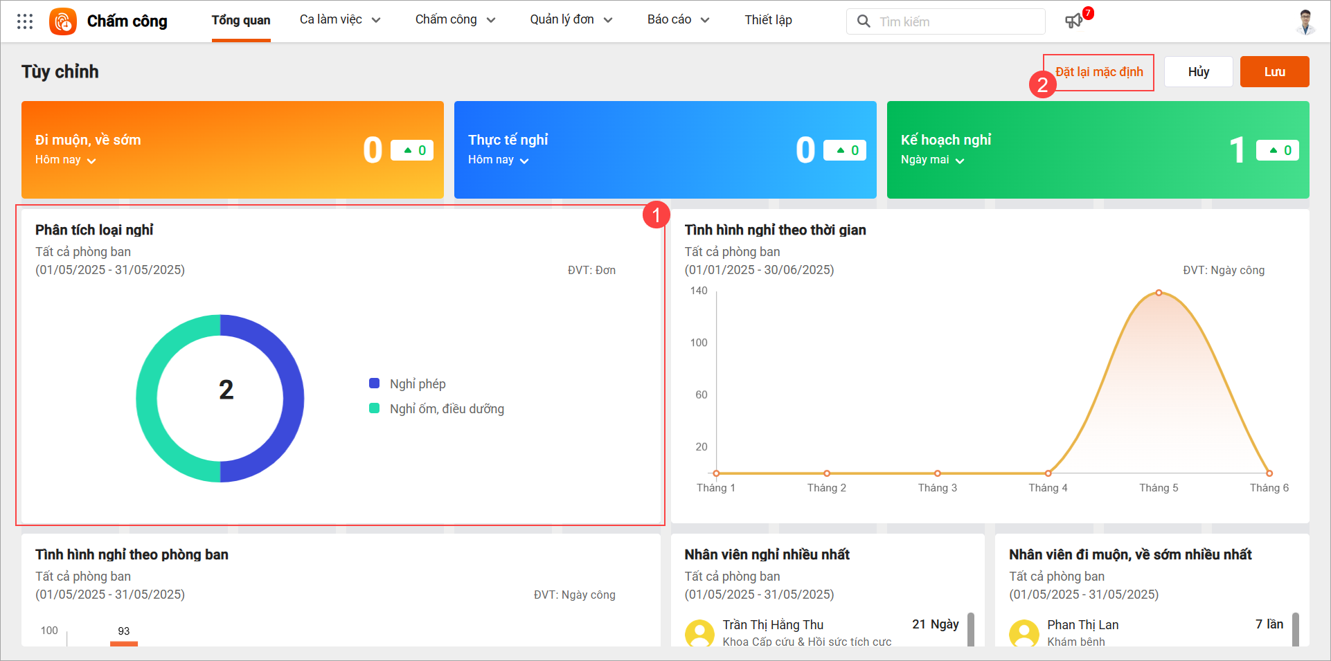 2 Tình hình nghỉ theo phòng ban Thống kê số ngày công nhân viên nghỉ từ bảng chấm công chi tiết và nhóm theo từng phòng ban/đơn vị Giúp Cán bộ/quản lý nắm bắt được phòng ban nào có nhân viên nghỉ nhiều để phân tích nguyên nhân, đưa ra kế hoạch công việc phù hợp