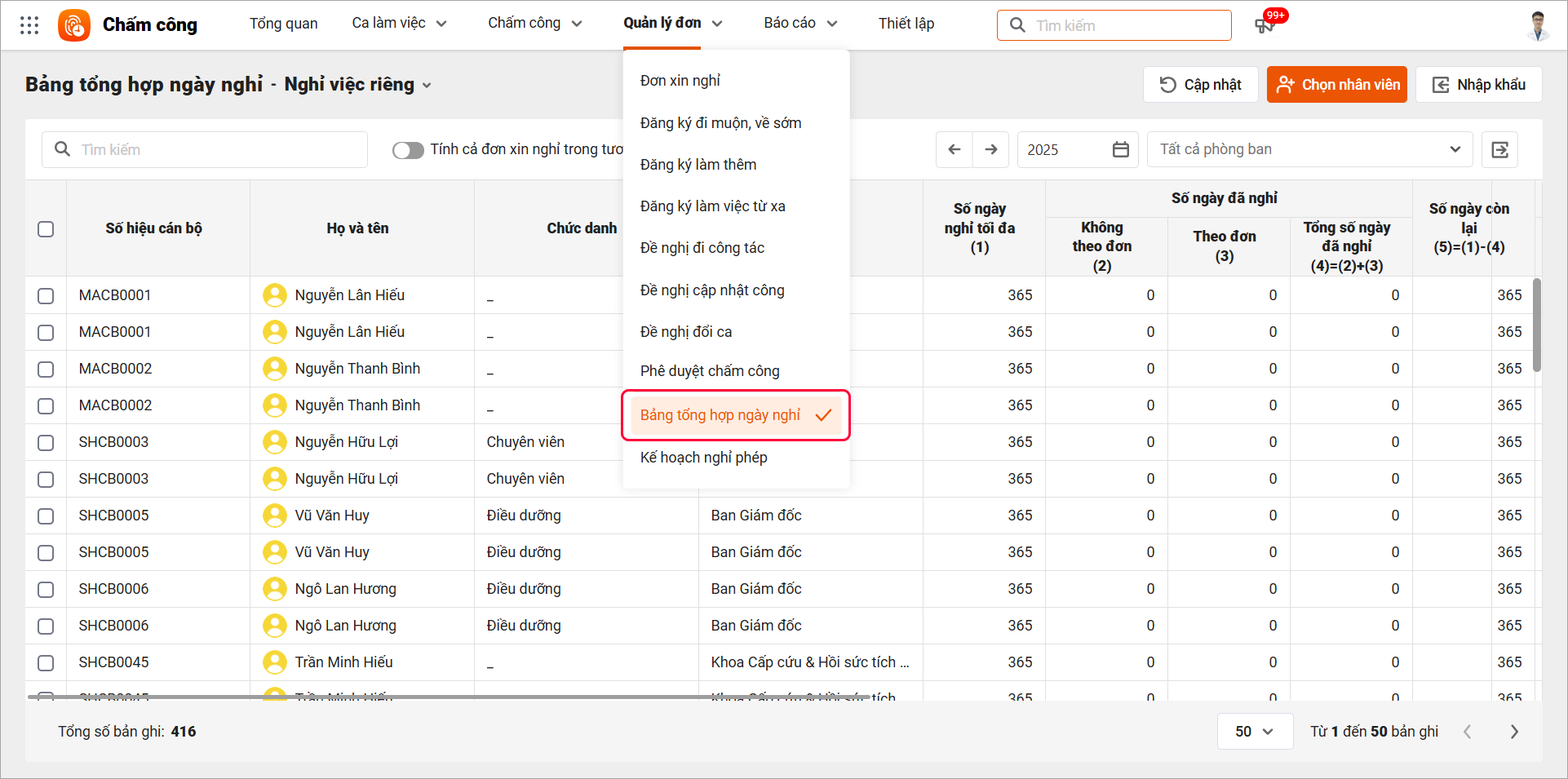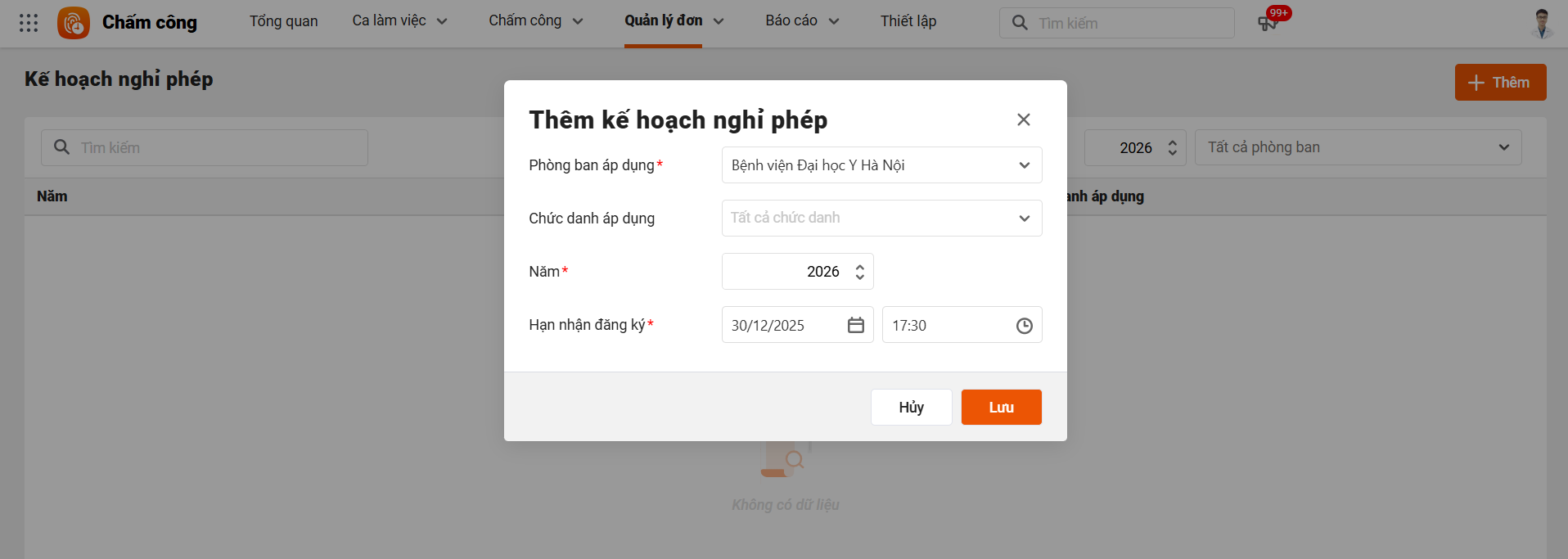 Ví dụ: Hiện tại đang là cuối năm 2025 và nhân viên muốn làm đơn xin nghỉ phép cho năm 2026, thì Cán bộ cần lập bảng tổng hợp nghỉ phép cho năm sau.