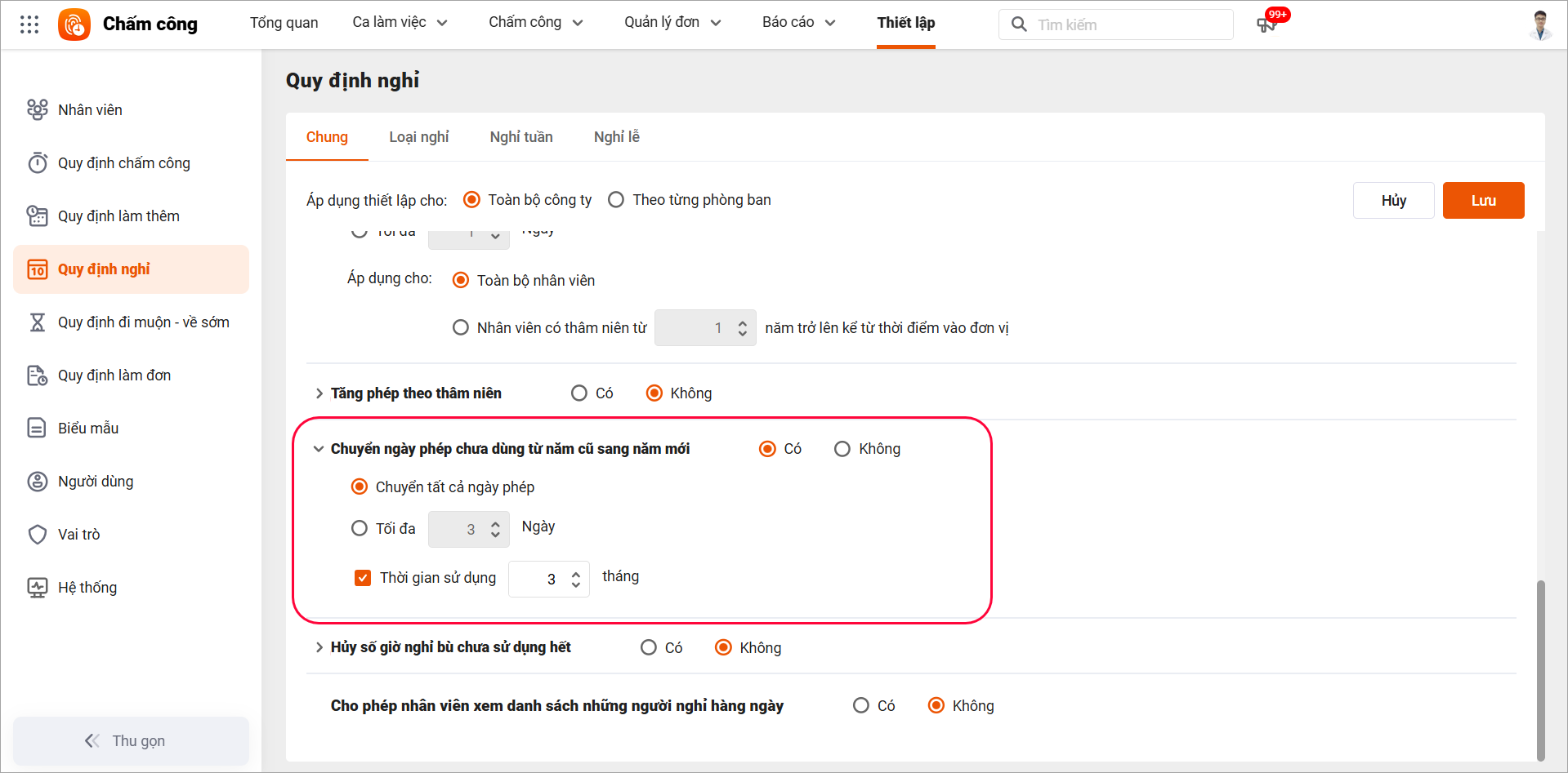 3. Kiểm tra thiết lập về chuyển ngày phép từ năm cũ sang năm mới
