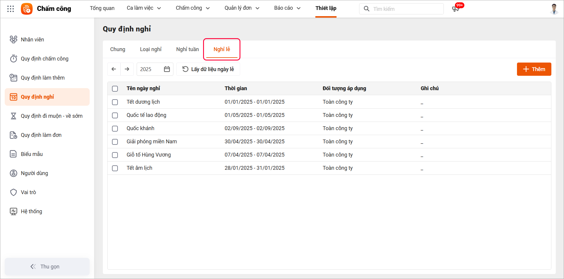 Xem hướng dẫn thiết lập quy định nghỉ lễ tại đây.