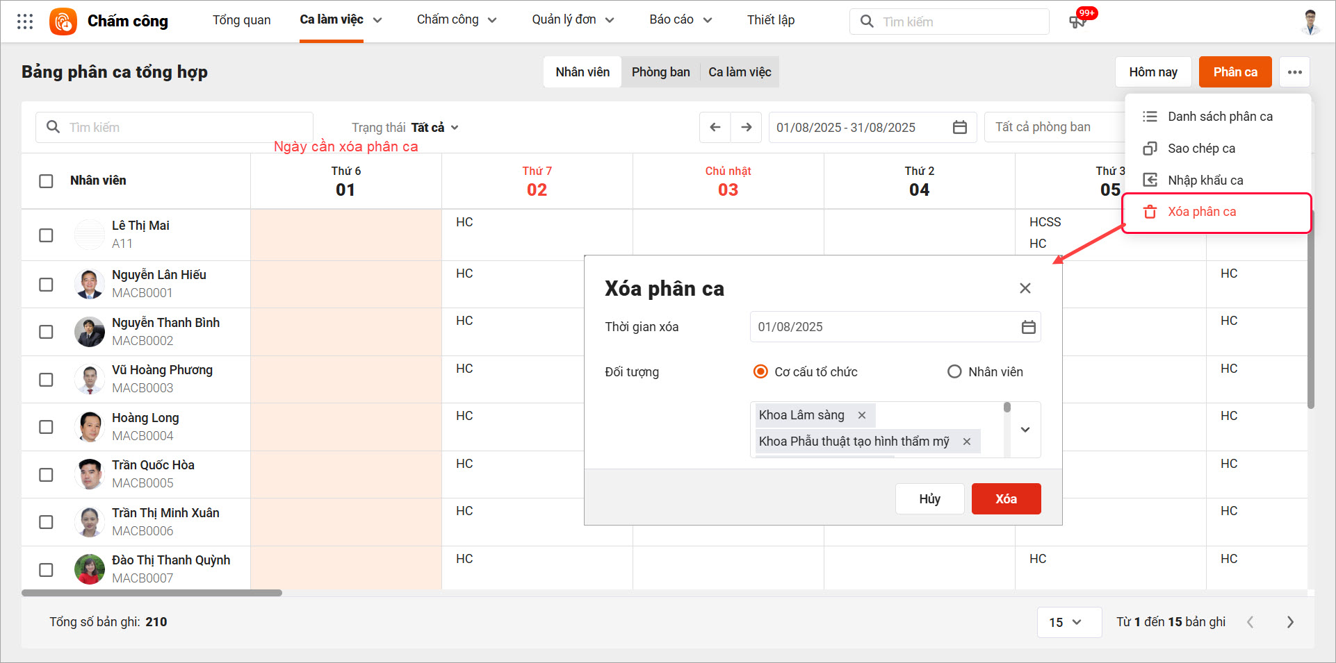 Tại Ca làm việc\Bảng phân ca tổng hợp: Chọn chức năng Xóa phân ca → nhập thời gian xóa là ngày 1/8 và đối tượng muốn xóa phân ca.