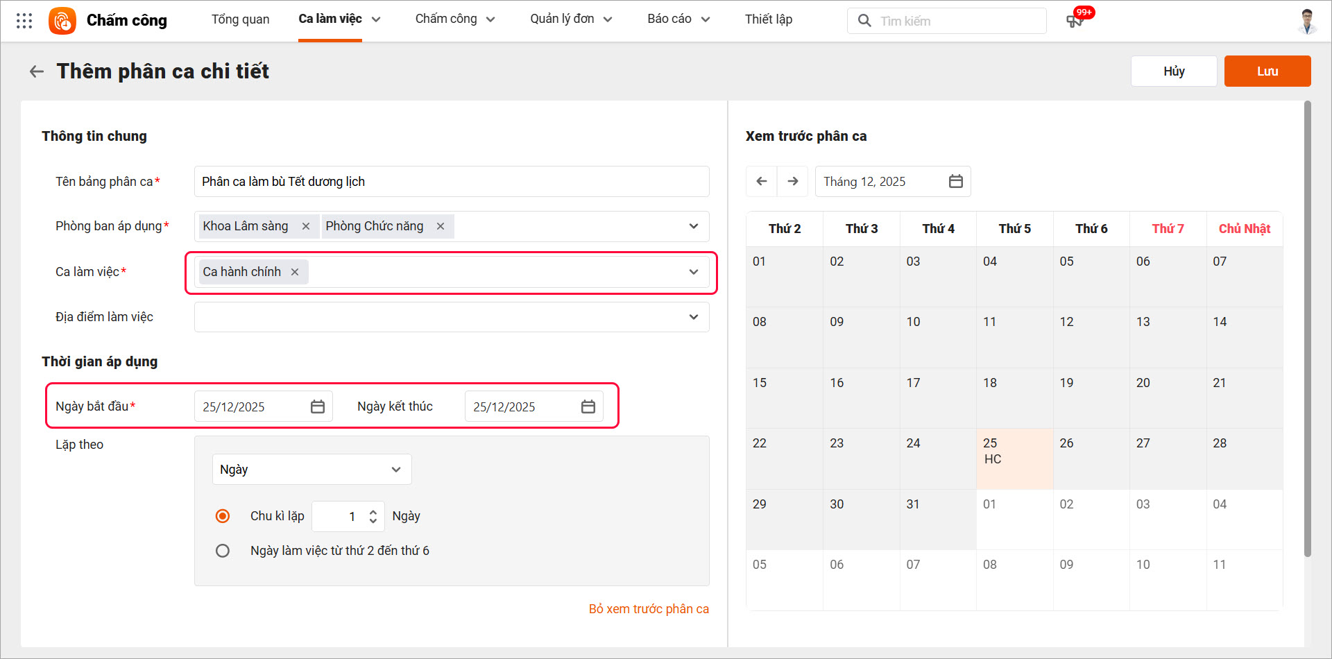 Sau khi lưu bảng phân ca chi tiết, kết quả phân ca sẽ được cập nhật vào bảng phân ca tổng hợp. Khi đó vào ngày thứ 7 (25/12), nhân viên sẽ được phân ca làm việc cả ngày: ca sáng và ca chiều.