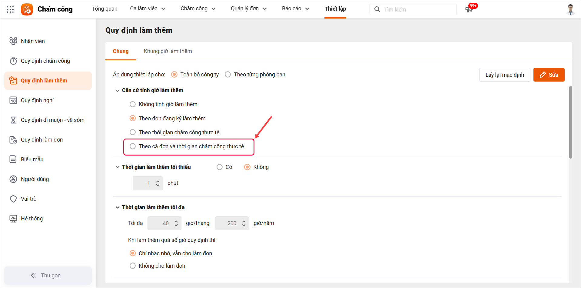Bước 2: Thiết lập ca làm việc được tính làm thêm giờ