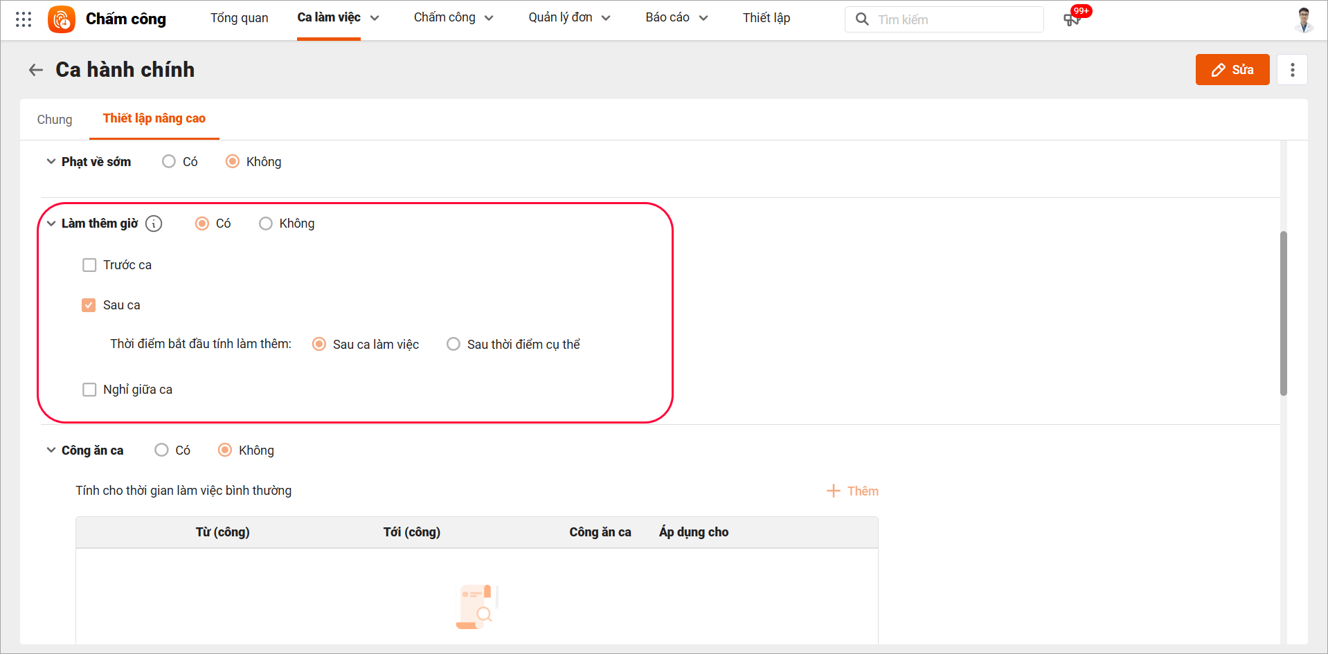 Tại Ca làm việc, mục Tùy chỉnh nâng cao: tích chọn “Làm thêm giờ” và các thời điểm cho phép nhân viên làm thêm (trước ca, sau ca, nghỉ giữa ca).