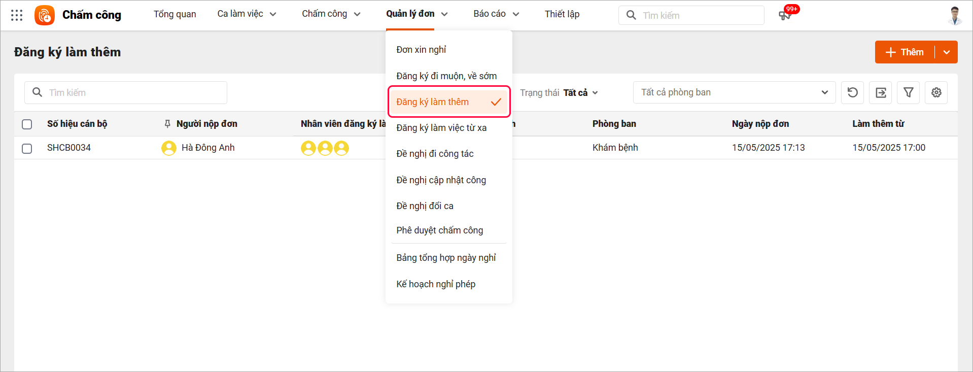 Khi nhân viên muốn làm thêm thì cần lập đơn và gửi quản lý duyệt trước, sau đó vẫn phải chấm công để Cán bộ nắm được thời gian làm việc thực tế. Cán bộ sẽ căn cứ vào đơn và cả thời gian check-in, check-out của nhân viên, đối chiếu xem con số nào nhỏ hơn thì sẽ lấy làm số giờ làm thêm thực tế.