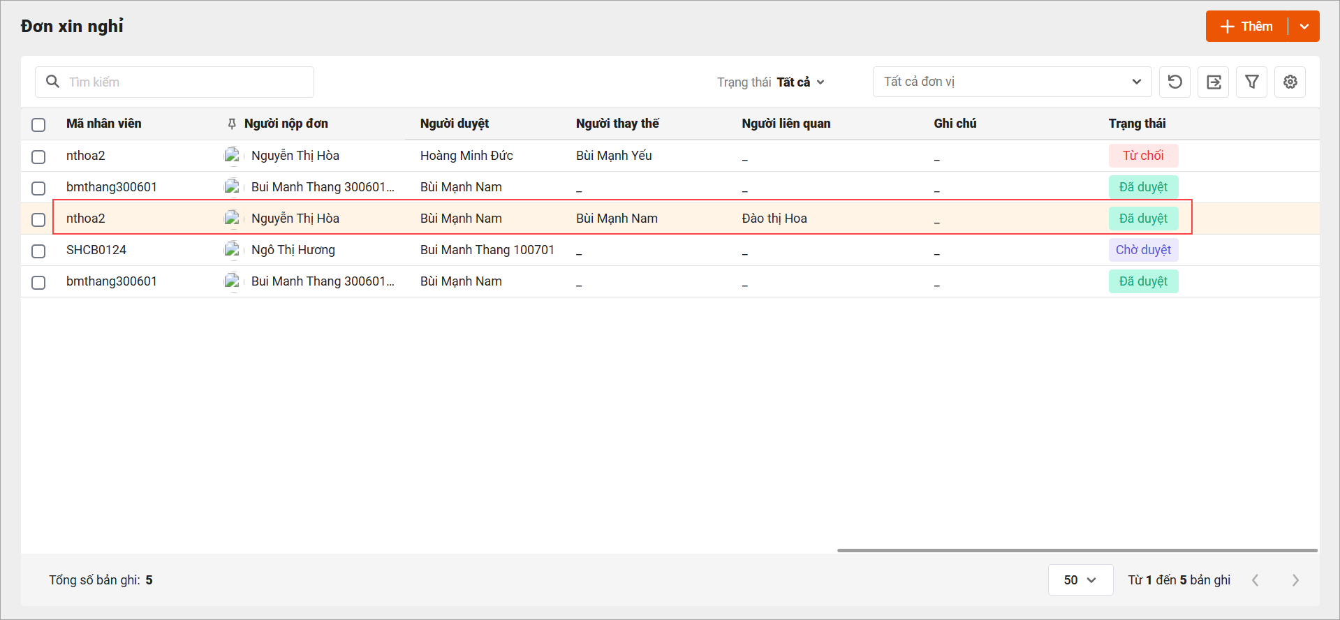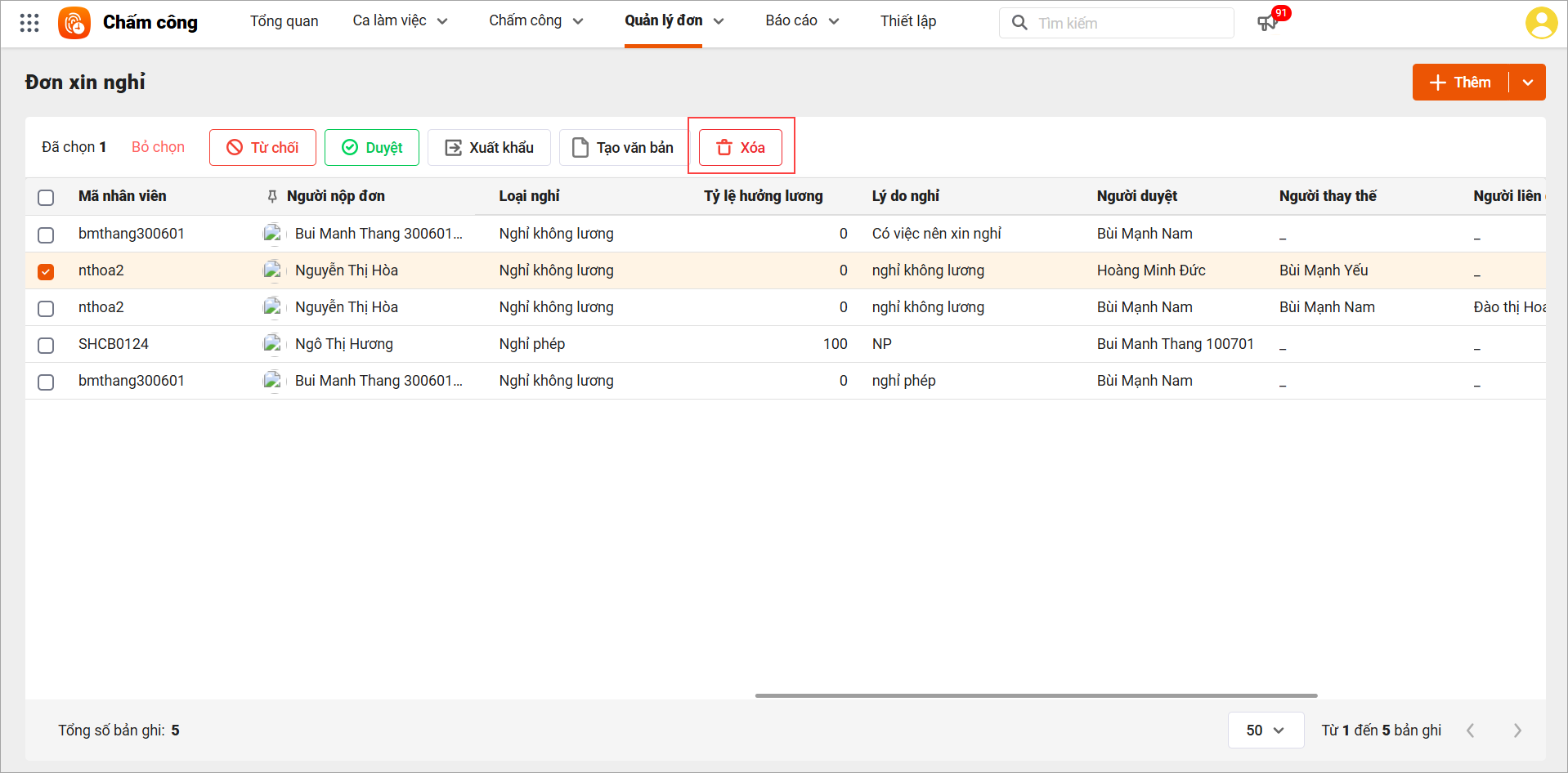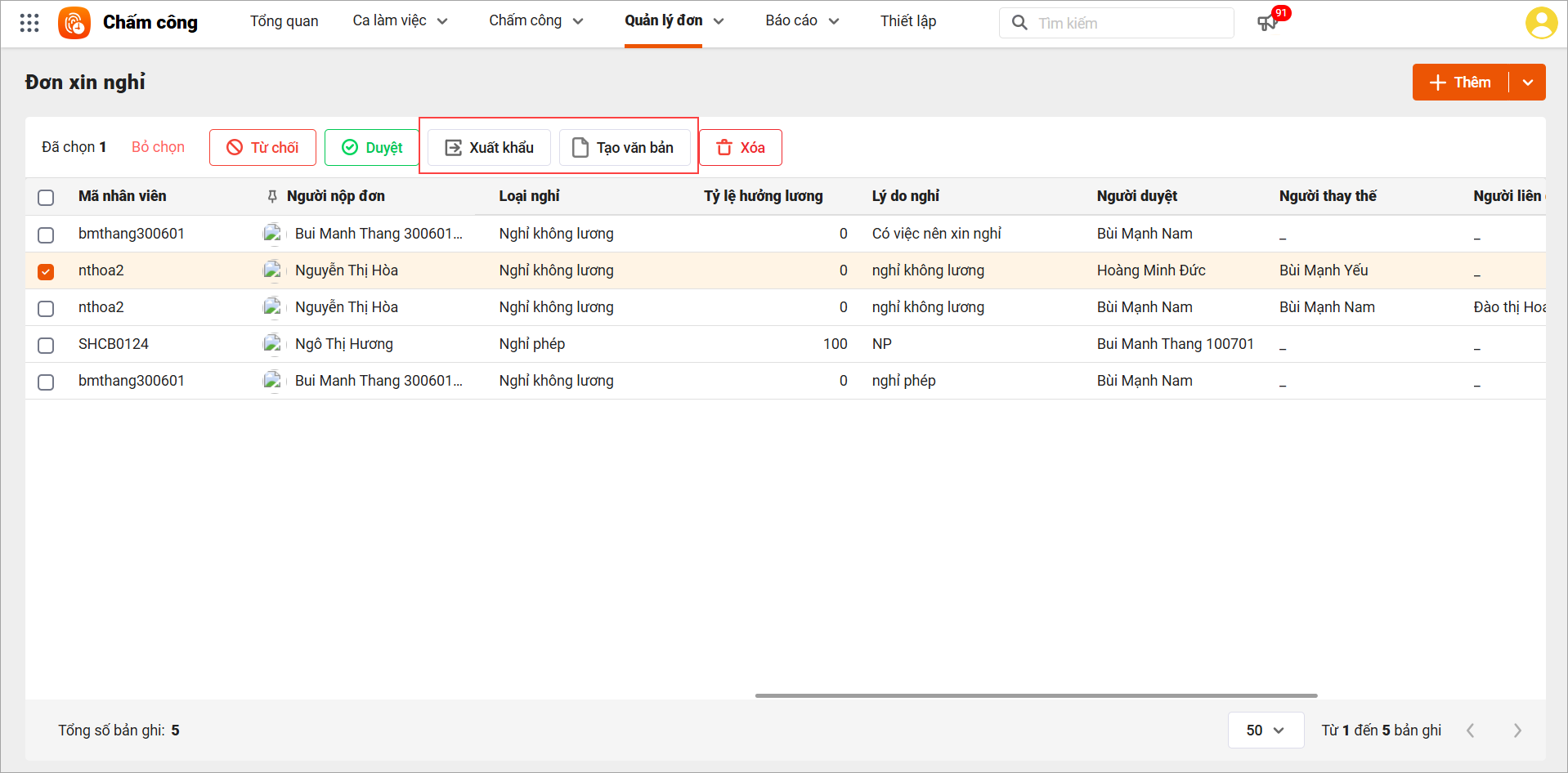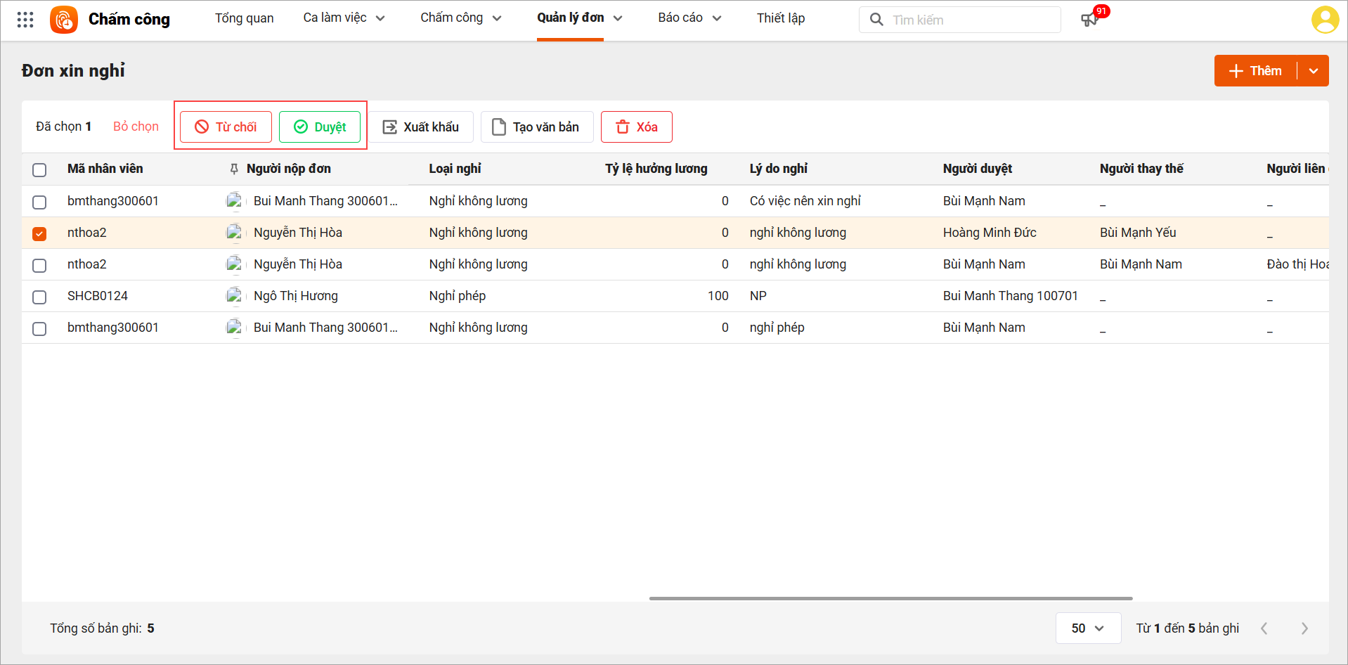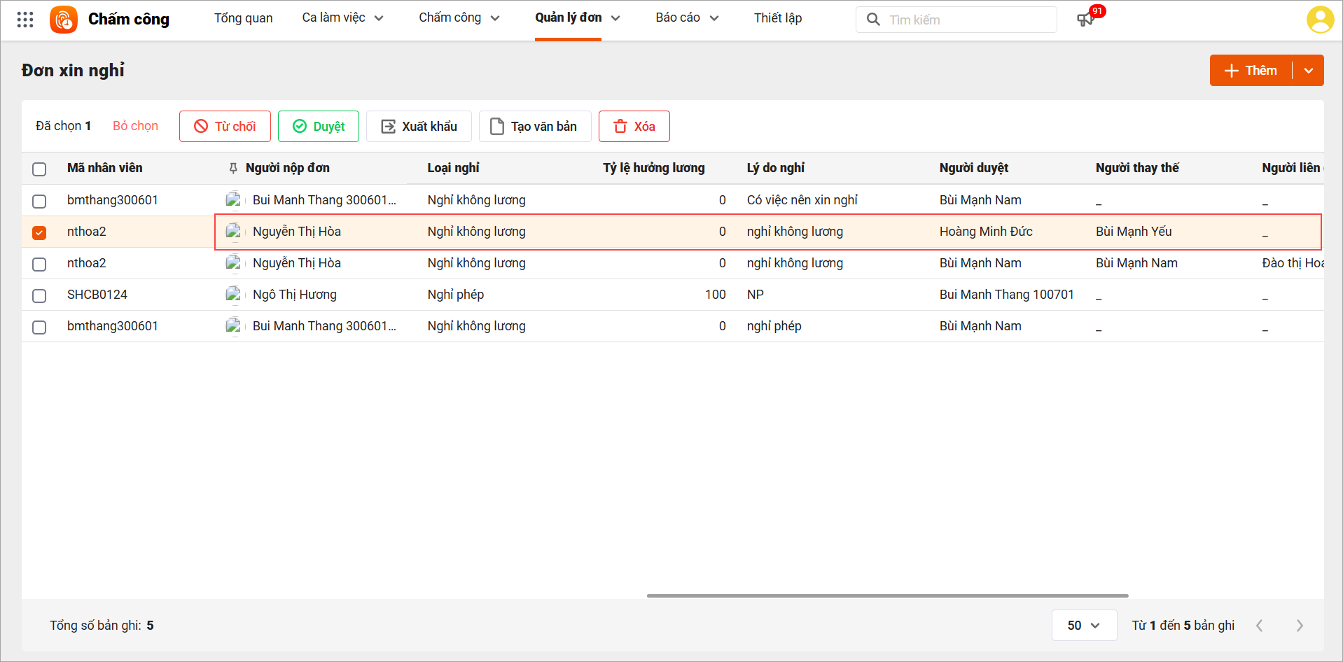 – Chọn đơn cần duyệt: Tích chọn đơn xin nghỉ của nhân viên cần duyệt trong danh sách (ví dụ đơn của Nguyễn Thị Hòa đang ở trạng thái “Chờ duyệt”).