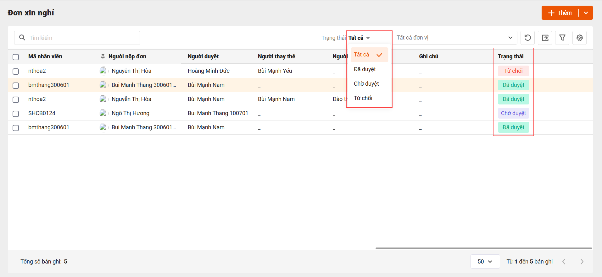 – Tại màn hình danh sách đơn, hiển thị tất cả các đơn nhân viên lập theo từng trạng thái: