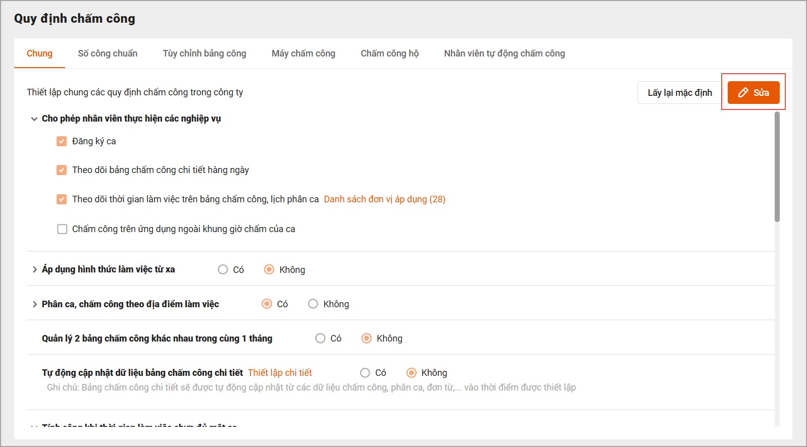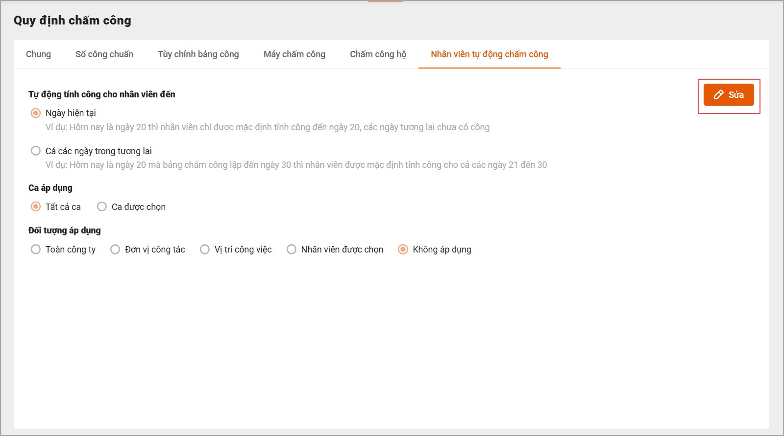 – Trên giao diện mục Nhân viên tự động chấm công, chọn Sửa để chỉnh sửa các thiết lập.