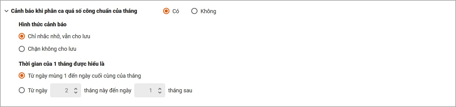 - Cảnh báo khi phân ca đã quá số công chuẩn của tháng: Giúp Cán bộ phân ca đúng mà không phải đối chiếu qua lại trên 2 phân hệ.
