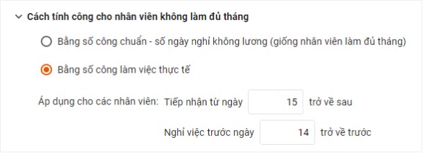 - Cách tính công cho nhân viên không làm đủ tháng: Giúp Cán bộ thiết lập cách tính công cho nhân viên không làm đủ tháng theo đúng quy định của đơn vị.