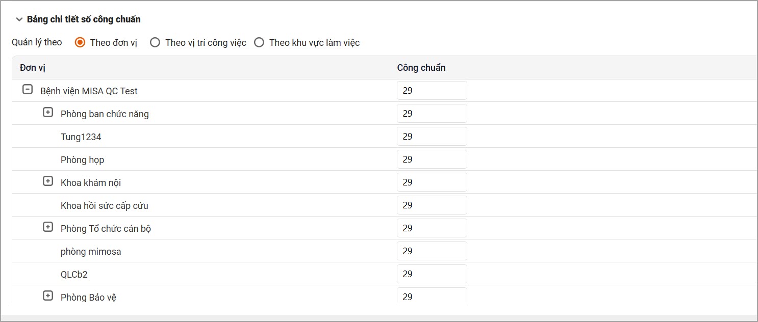 - Bảng chi tiết số công chuẩn: Giúp Cán bộ quy định được số công chuẩn theo từng vị trí công việc hoặc đơn vị trong cơ cấu tổ chức.