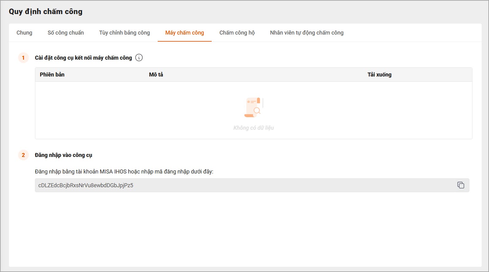 - Máy chấm công: Kết nối máy chấm công vân tay/khuôn mặt chuyên dụng để lấy dữ liệu chấm công. Xem các bước kết nối máy chấm công chi tiết tại đây.
