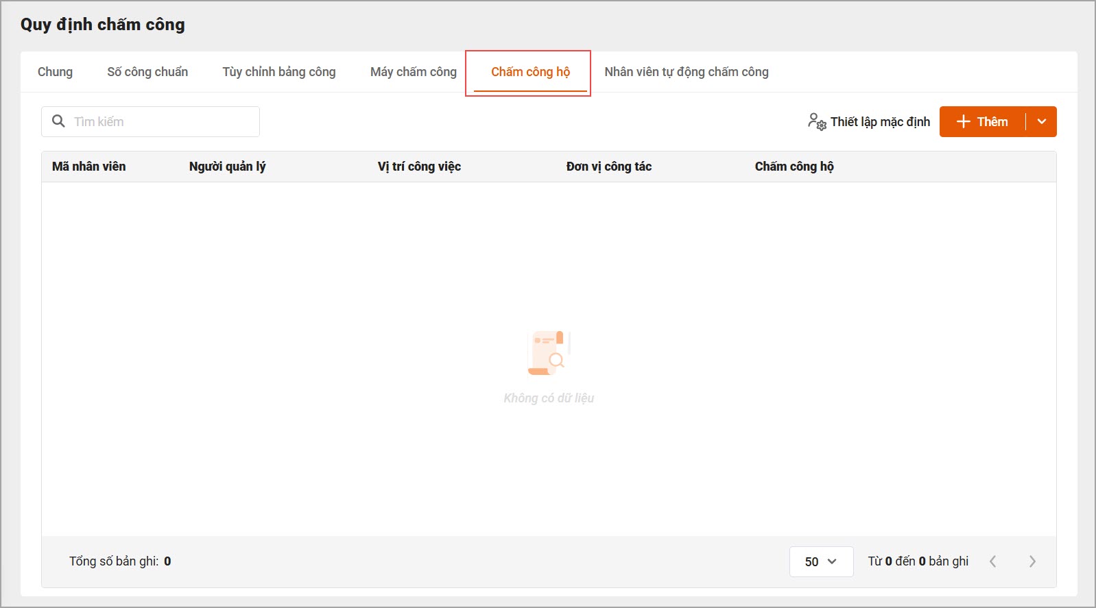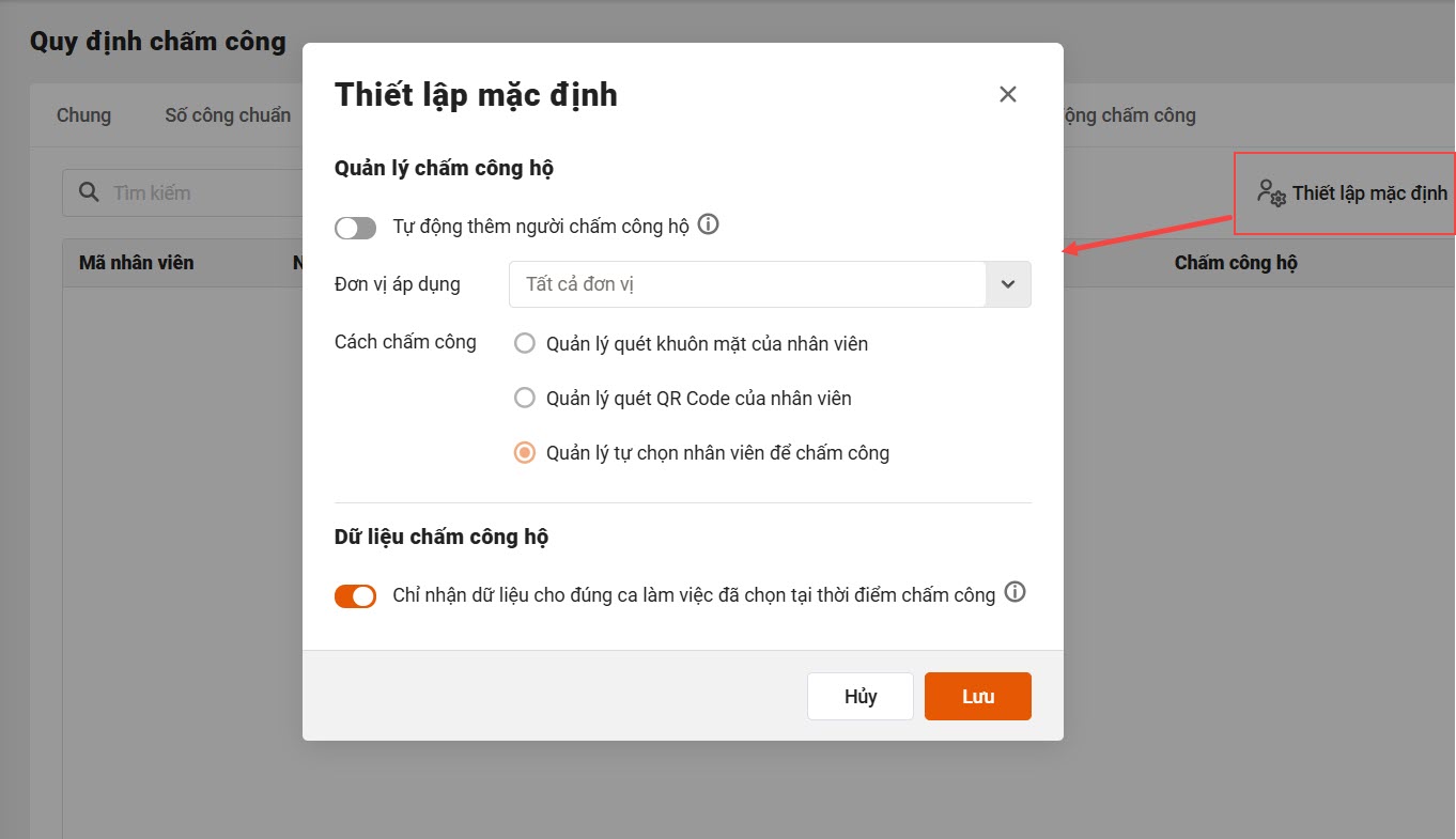 – Chọn Thiết lập mặc định để xác định quy tắc và phương thức quản lý chấm công hộ chung cho toàn bộ bệnh viện hoặc từng khoa/phòng cụ thể.