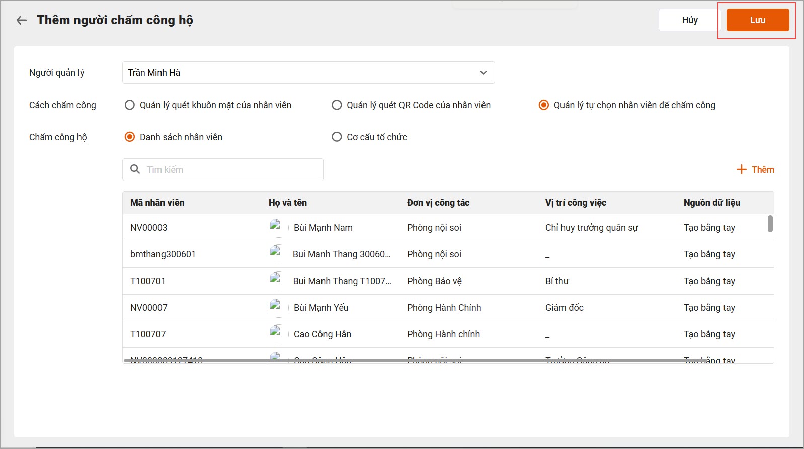 - Quản lý tự chọn cán bộ nhân viên để chấm công (thường chọn mục này)