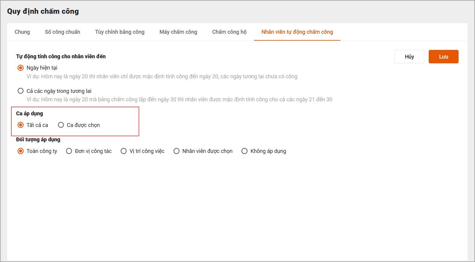 - Chọn Ca được chọn: Chỉ áp dụng cho một số ca cụ thể do anh/chị lựa chọn sau đó.