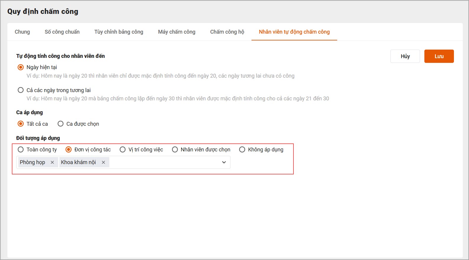- Chọn đơn vị áp dụng: Chọn khoa/phòng hoặc Tất cả đơn vị để áp dụng quy định chấm công hộ.