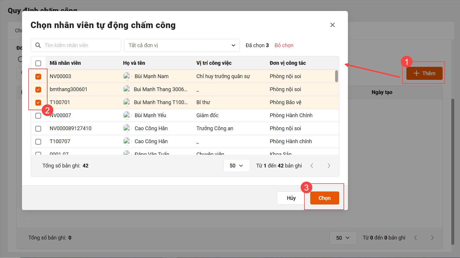 - Nhân viên được chọn: Cán bộ click vào “Thêm” Tích chọn nhân viên vào danh sách được tự động chấm công.