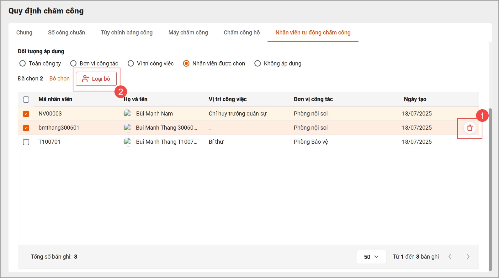 – Để xóa nhân viên khỏi danh sách, Cán bộ di chuột đến dòng tên của nhân viên và nhấn vào biểu tượng thùng rác (1) , hoặc tích chọn để loại bỏ hàng loạt (2).