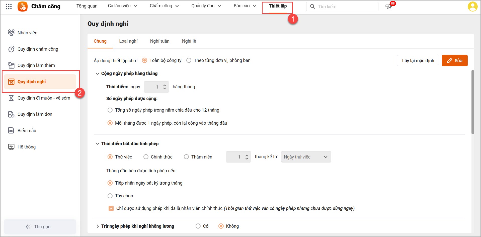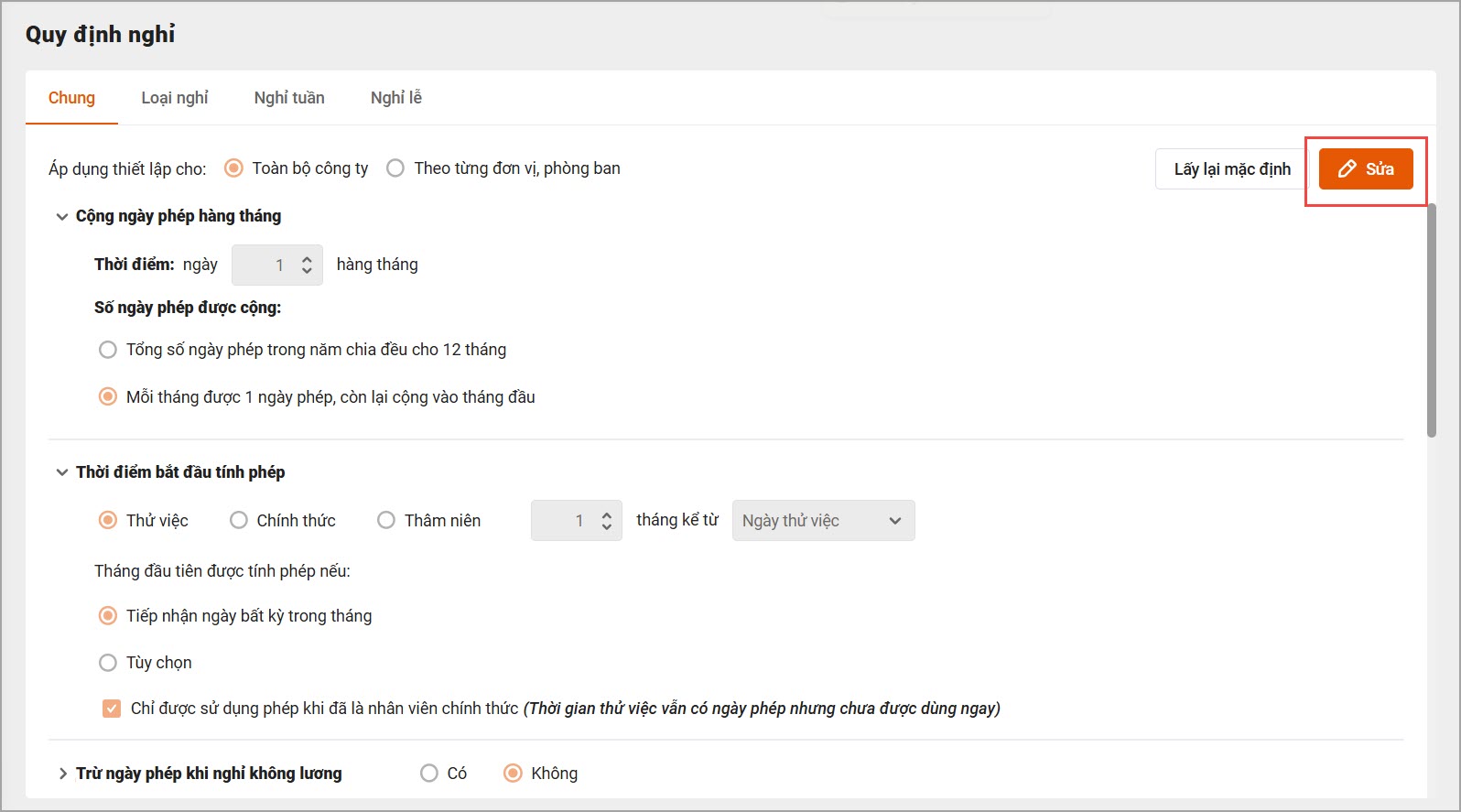 | 1 | Tính phép cho thời gian thử việc | Thiết lập thời gian thử việc có được tính phép hay không, nếu có thì vào làm ngày trước ngày bao nhiêu sẽ được tính phép | Làm căn cứ tính số ngày phép trong năm, số ngày phép từng tháng của nhân viên trên bảng tổng hợp nghỉ phép |