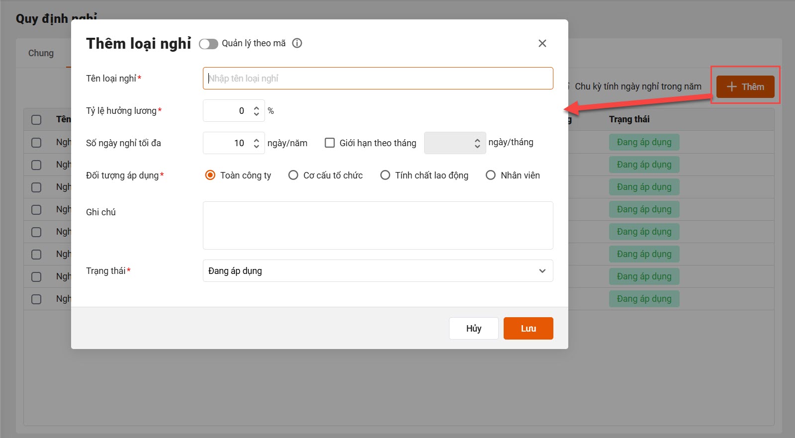 - Để thêm loại nghỉ: Nhấn Thêm → Nhập các thông tin cần khai báo.