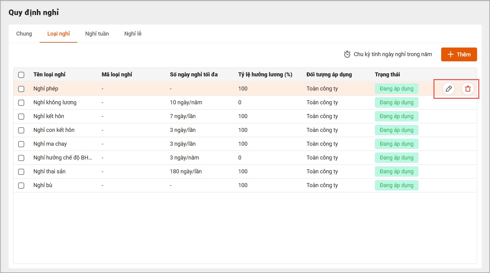 - Để sửa, xóa loại nghỉ: Di chuột vào từng dòng và chọn biểu tượng tương ứng với chức năng muốn thực hiện.