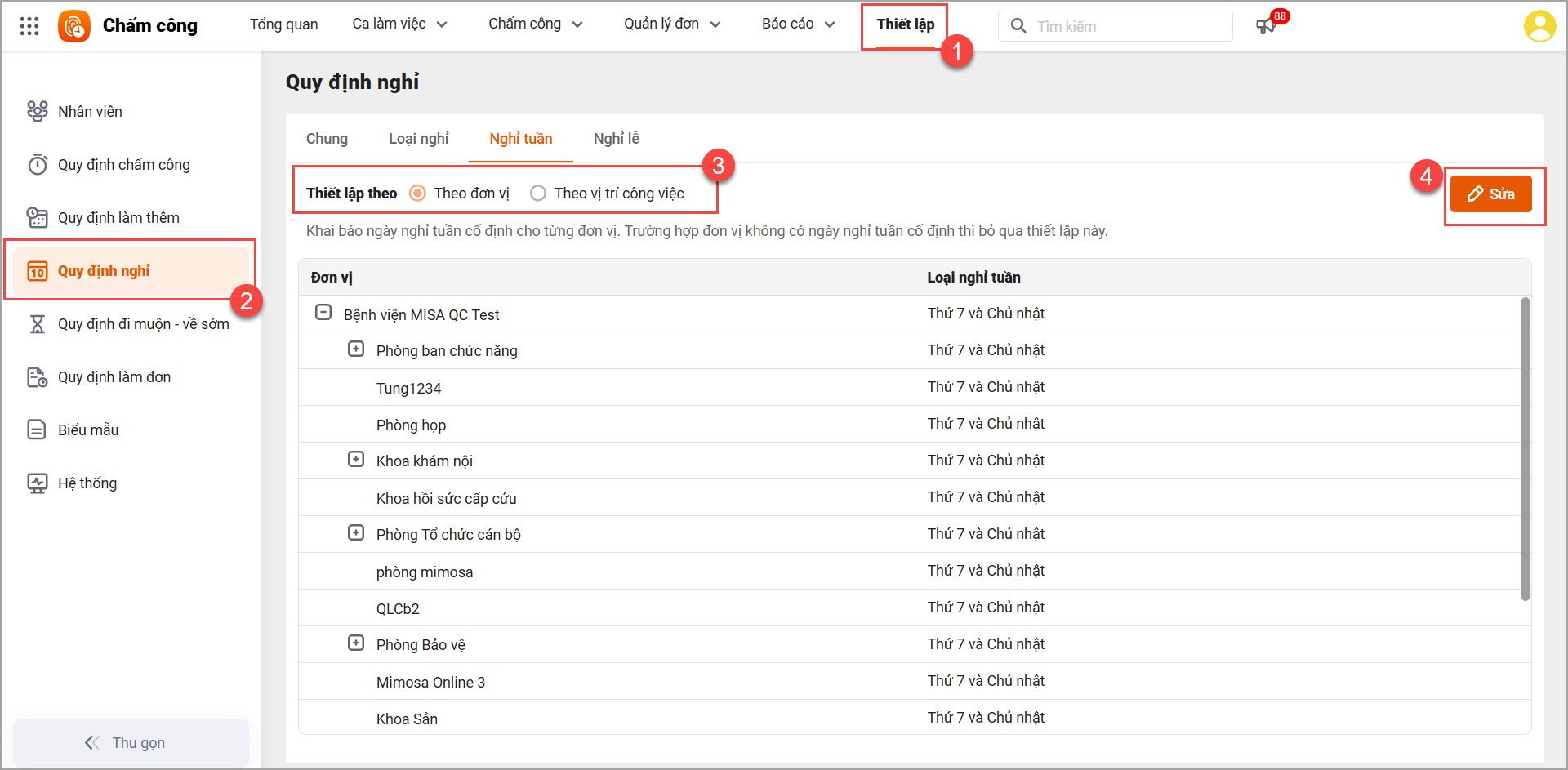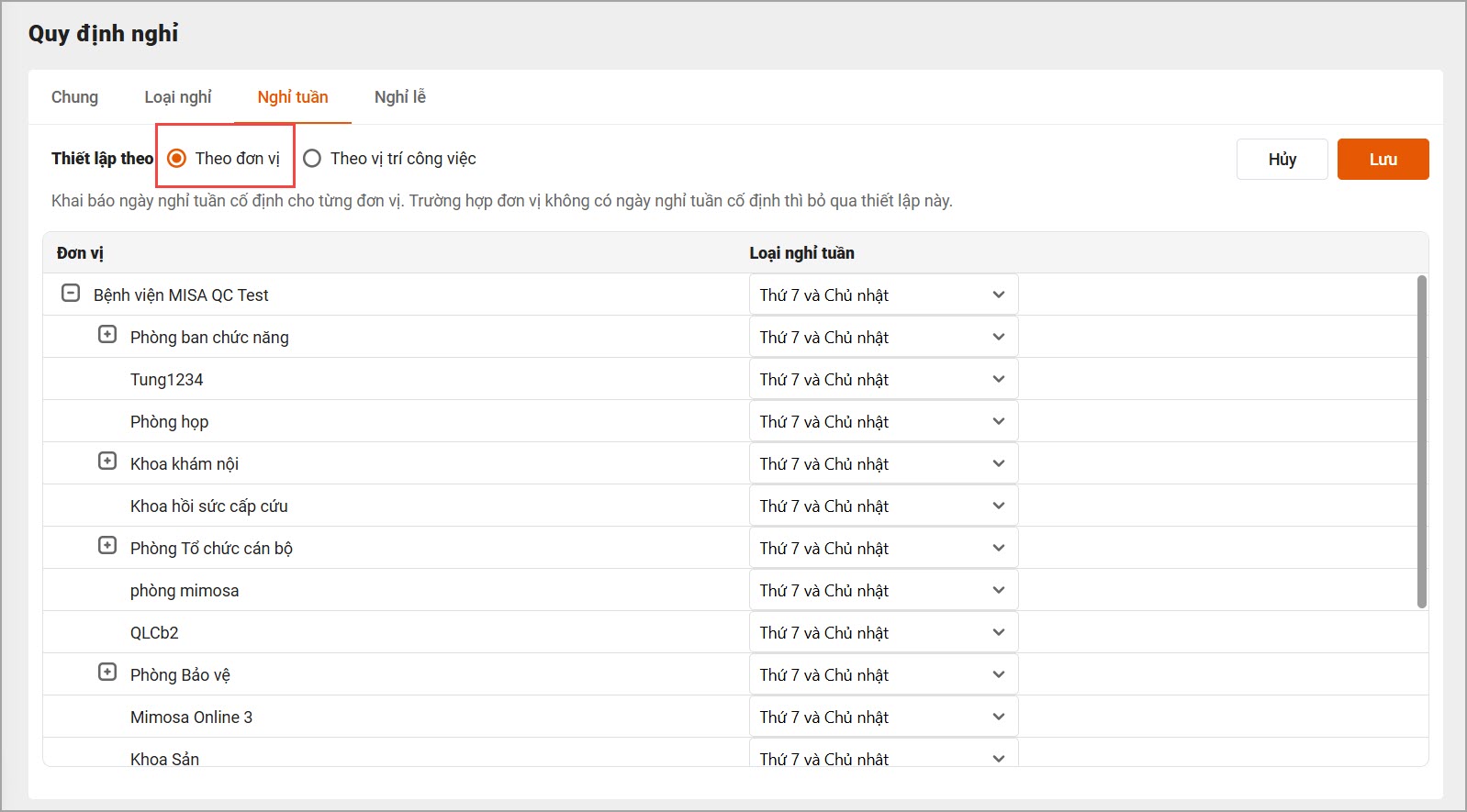 - Vào phân hệ Thiết lập\Quy định nghỉ\Nghỉ tuần. Tại đây, Cán bộ lựa chọn thiết lập theo đơn vị hoặc theo vị trí công việc, với các loại nghỉ tương ứng.
