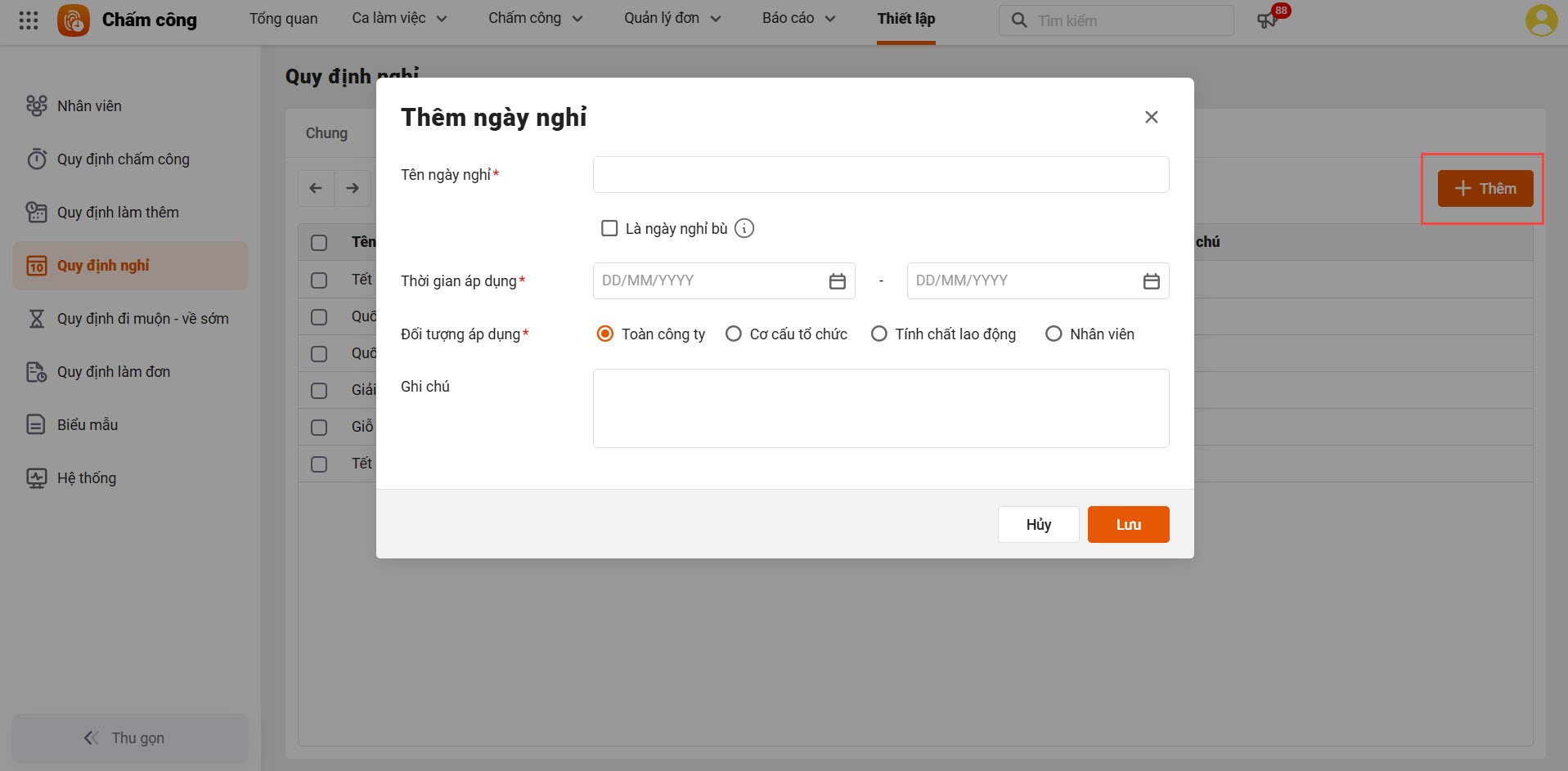 - Để thêm ngày nghỉ lễ, nhấn Thêm → Nhập các thông tin cần khai báo.