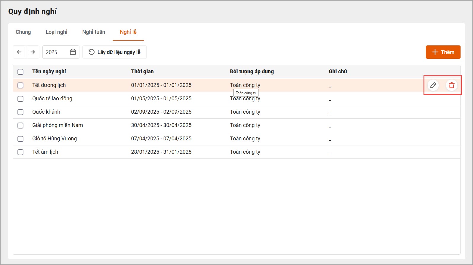 - Để sửa, xóa ngày nghỉ lễ: Di chuột vào từng dòng và chọn biểu tượng tương ứng với chức năng muốn thực hiện.