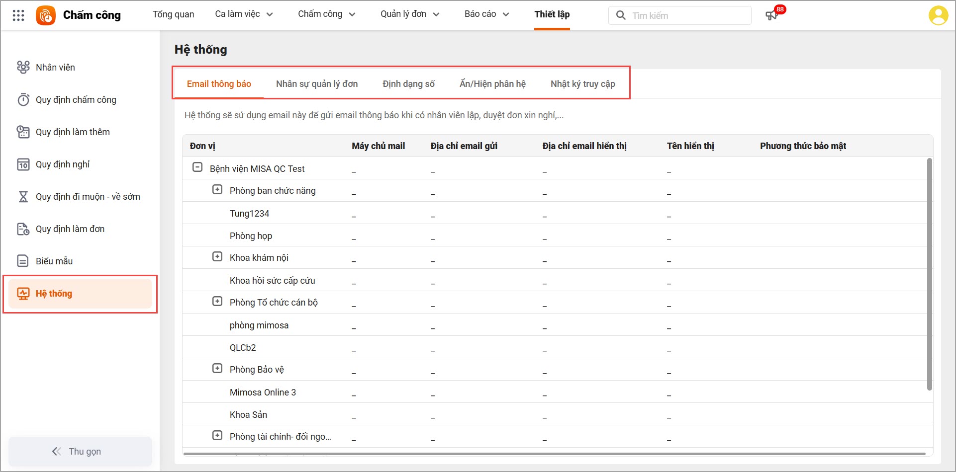 Thiết lập cấu hình mail cho từng khoa phòng để gửi các loại email thông báo cho CBNV khi có phát sinh đơn được lập, duyệt (đơn xin nghỉ, làm thêm, đi công tác,…), thông báo xác nhận công hàng tháng,…