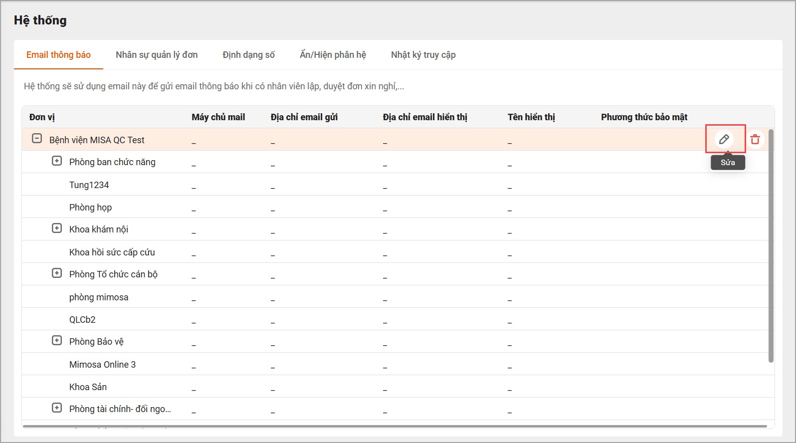 – Khi mới sử dụng phần mềm, chương trình sẽ để trống cấu hình mail tại tất cả đơn vị. Nhấn nút Sửa tại từng dòng để thiết lập cấu hình mail: