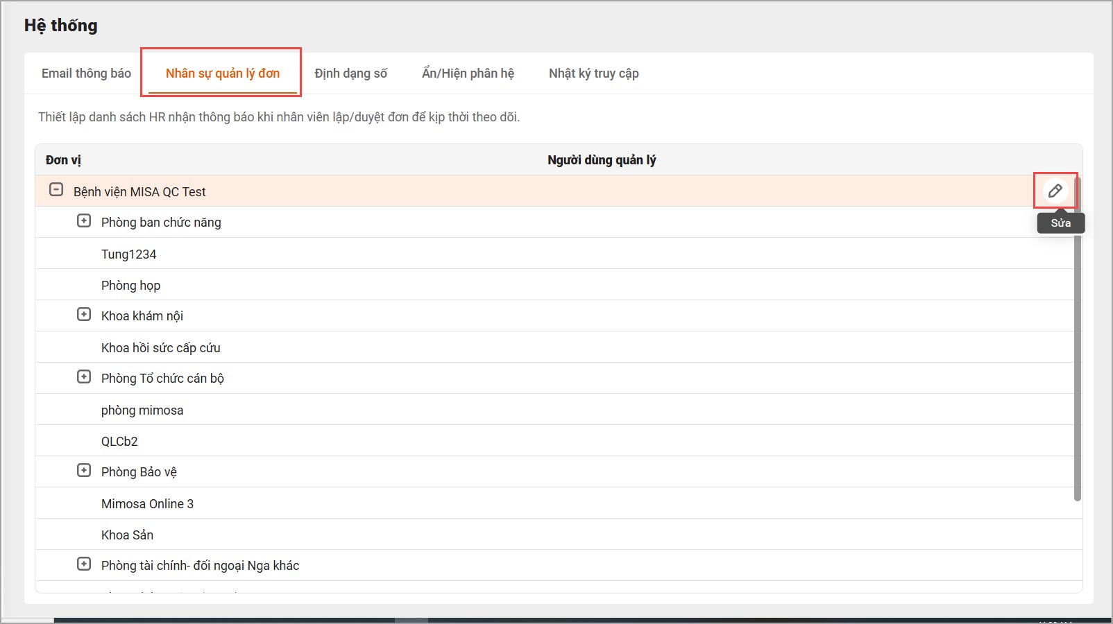 Thiết lập nhân sự quản lý tại từng đơn vị để nhận các thông báo trên ứng dụng Chấm công như khi CBNV lập đơn, quản lý duyệt đơn,… Nhân sự được thiết lập tại khoa phòng nào thì sẽ chỉ nhận được các thông báo liên quan đến nCBNV thuộc khoa phòng đó.
