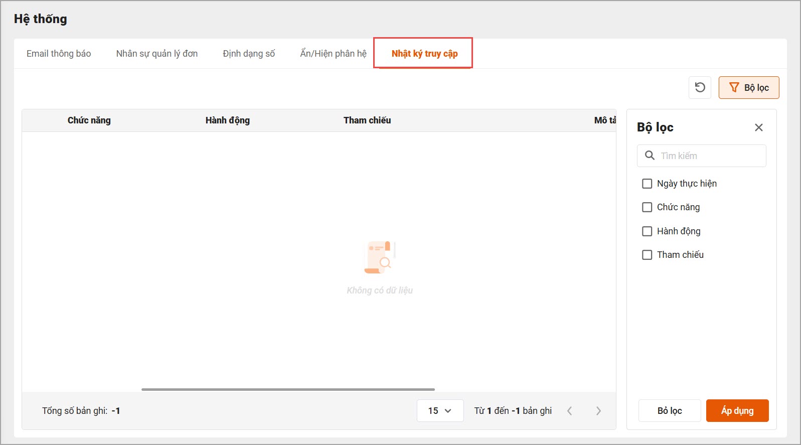 Tại phân hệ Thiết lập\Hệ thống\Nhật ký truy cập: Hiển thị đầy đủ lịch sử thao tác của tất cả người dùng trên ứng dụng. Ngoài ra, cho phép sử dụng Bộ lọc để tìm kiếm nhanh thông tin cần thiết.
