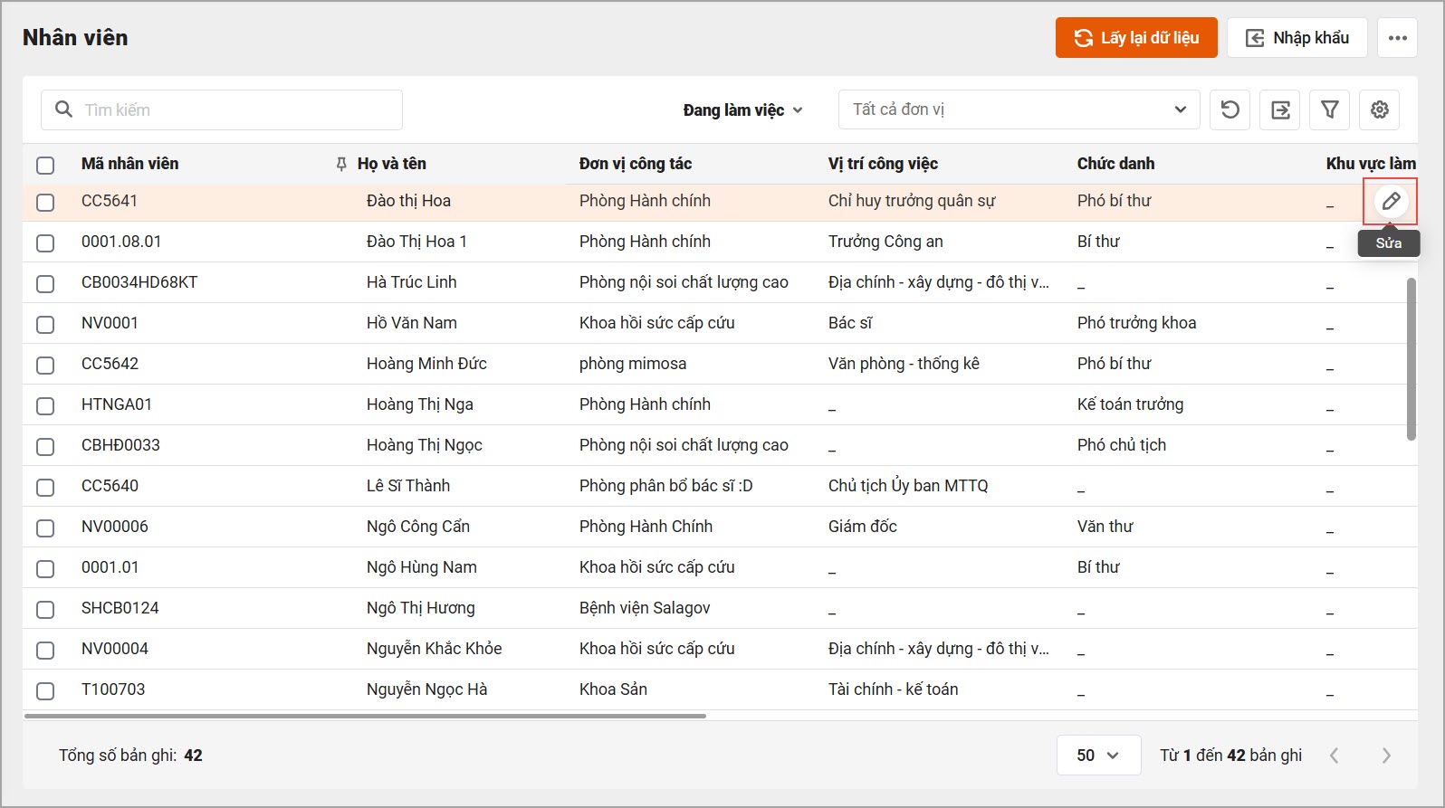 Tại từng dòng CBNV, nhấn biểu tượng Sửa.