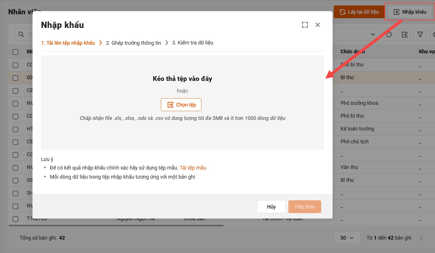 Tại màn hình danh sách CBNV, nhấn Nhập khẩu và thực hiện theo các bước cho đến khi hoàn tất.