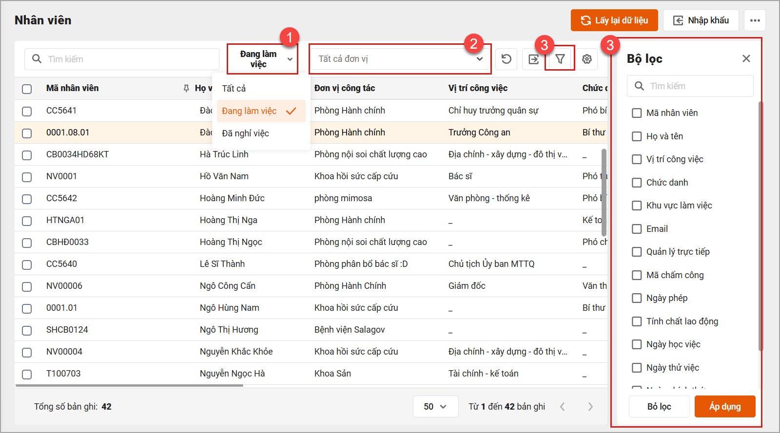 (1) Lọc theo trạng thái lao động: Đang làm việc, Đã nghỉ việc.