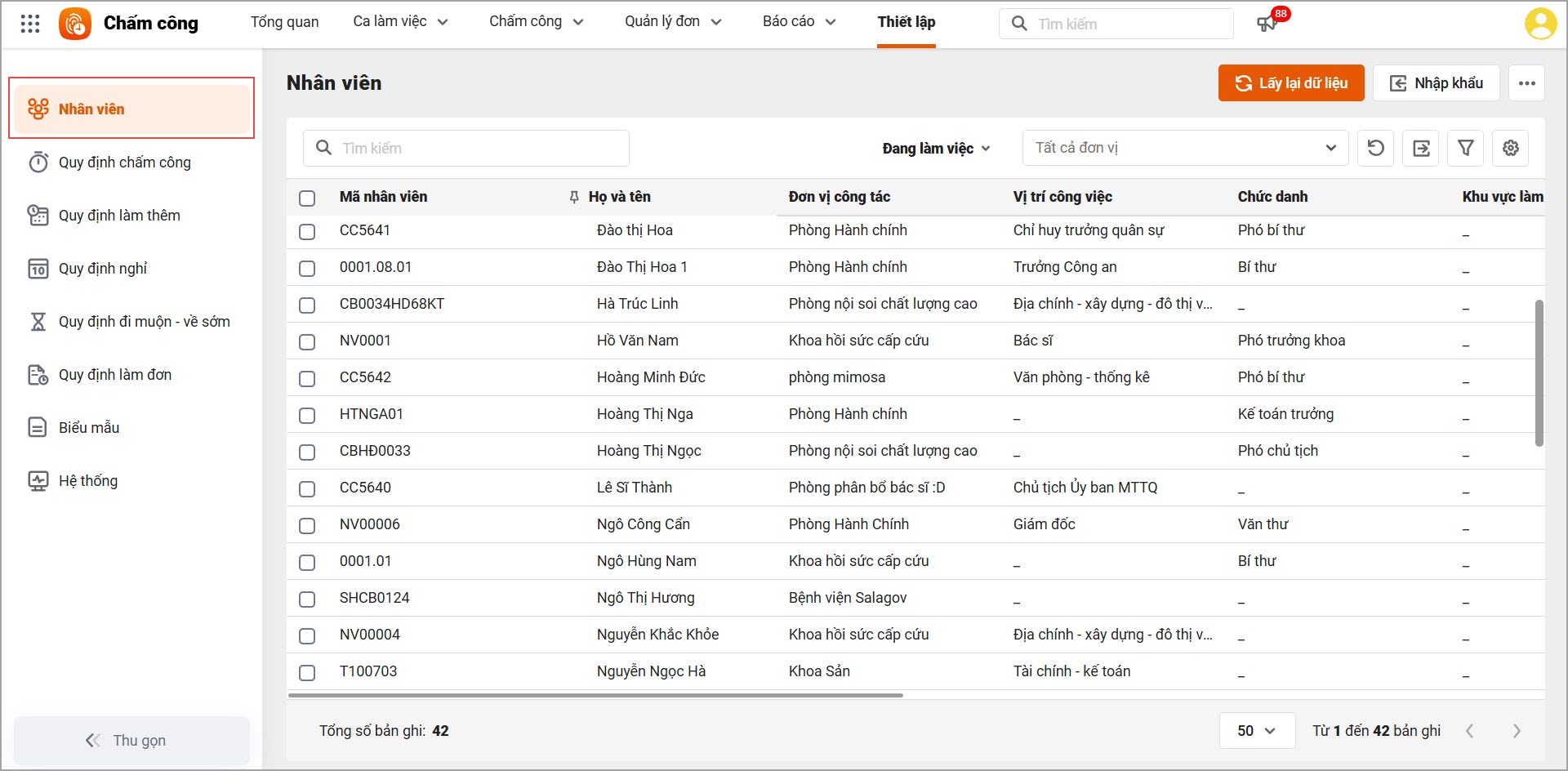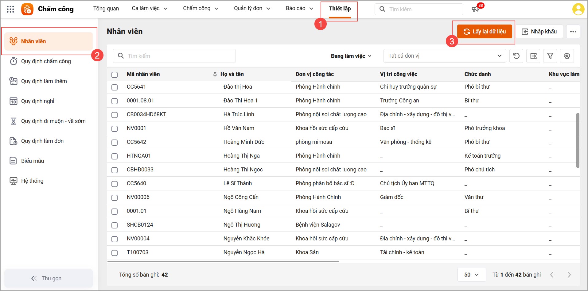 - Tại phân hệ Thiết lập\Nhân viên: Nhấn Lấy lại dữ liệu.
