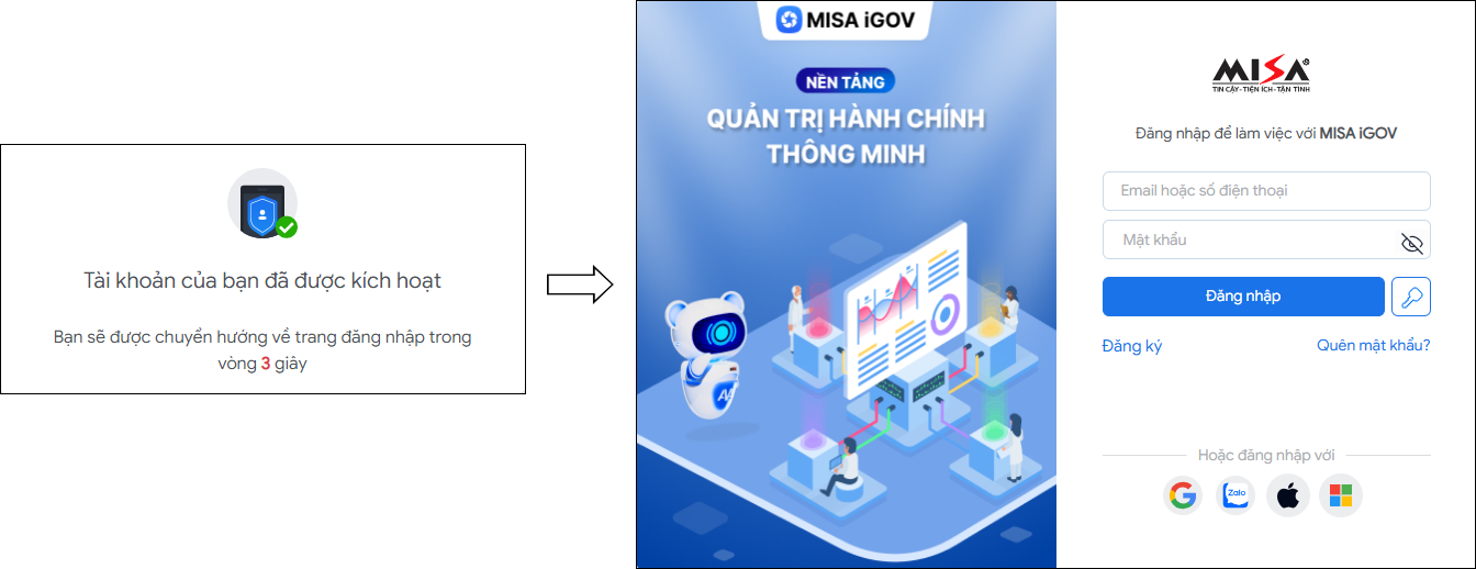 4. Hệ thống hiển thị thông báo tài khoản được kích hoạt thành công và tự chuyển hướng về trang đăng nhập MISA iGOV.
