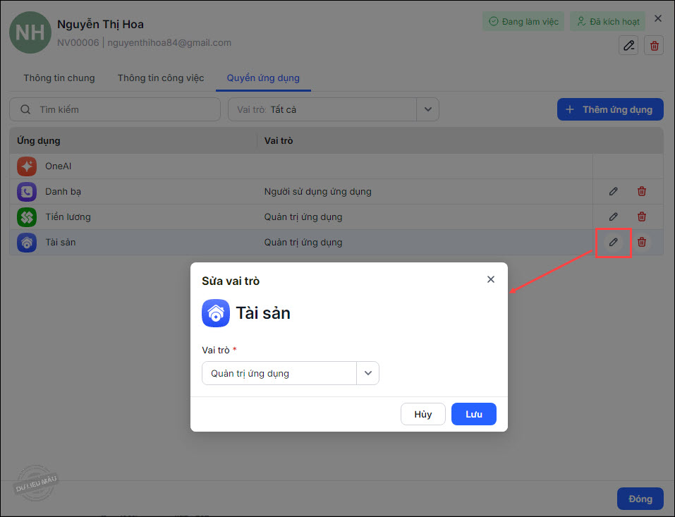 Để sửa vai trò của người dùng, chọn vào biểu tượng Sửa ở ứng dụng cần sửa, chọn lại vai trò và nhấn Lưu.