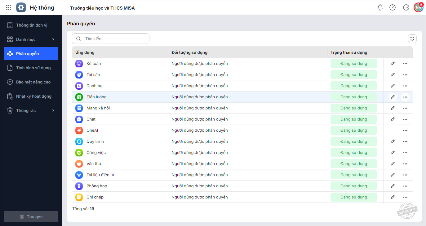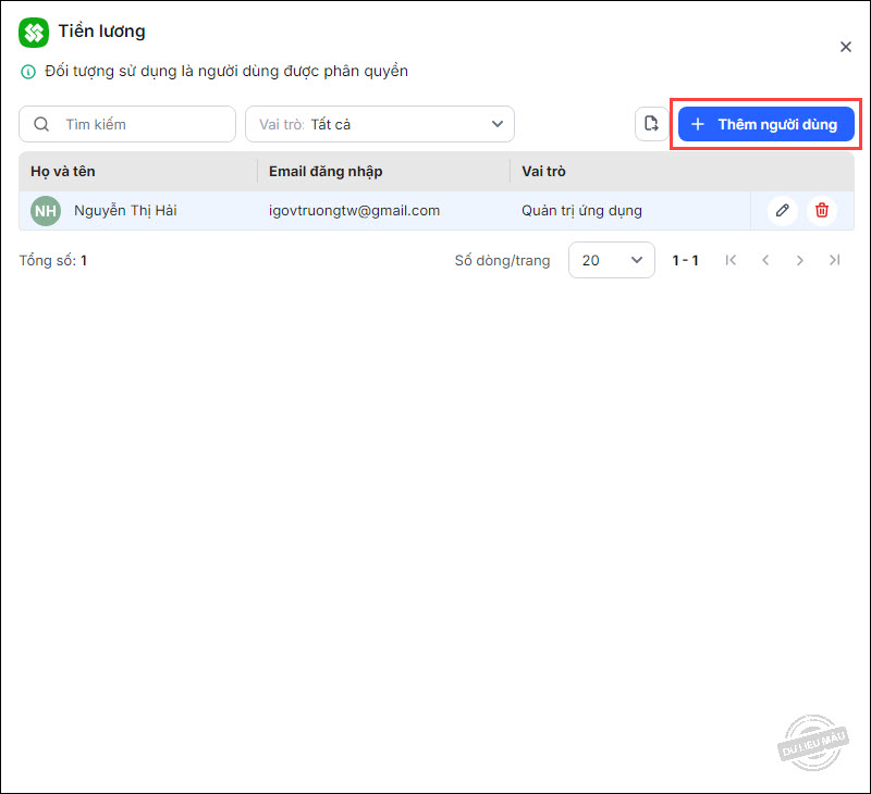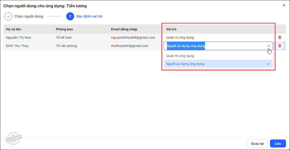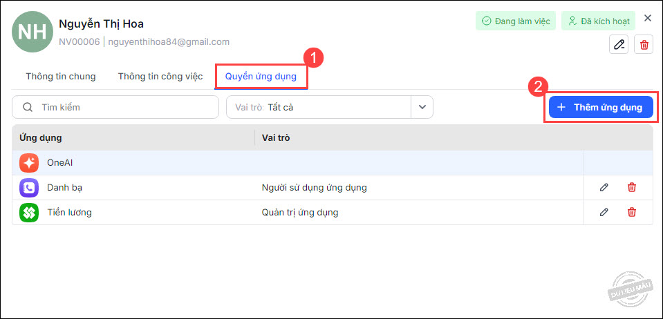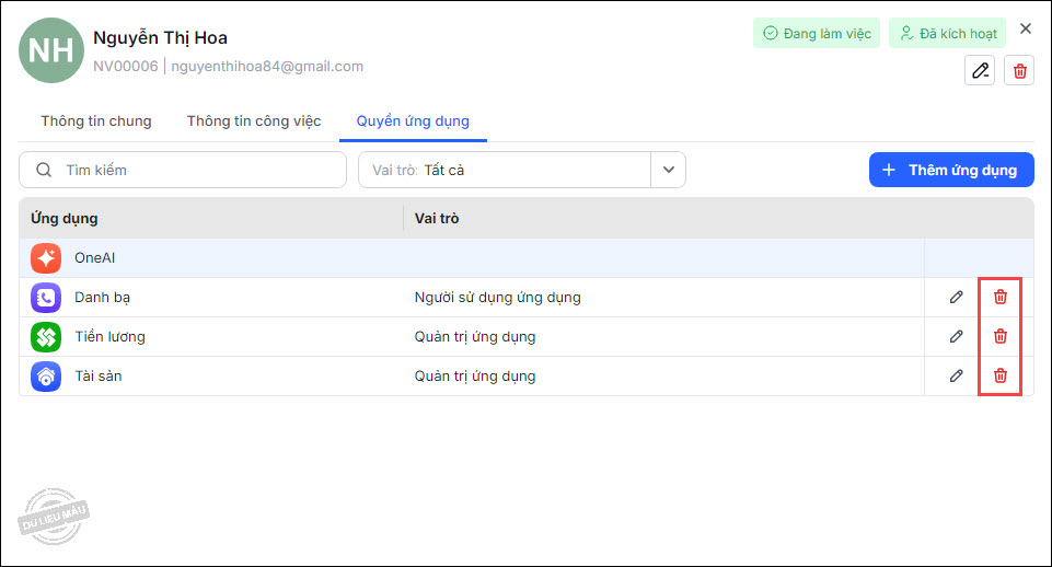 Để xóa bỏ vai trò của người dùng khỏi ứng dụng, tại danh sách người dùng được phân quyền, chọn vào biểu tượng Xóa ở cuối dòng.