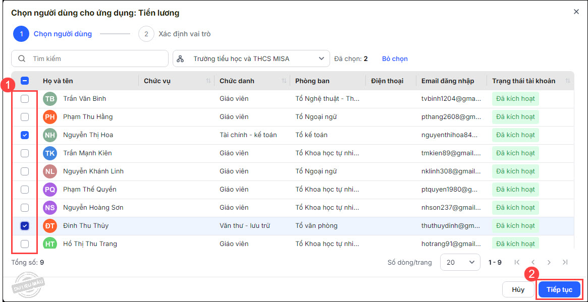 - Tích chọn người dùng cần phân quyền. Nhấn Tiếp tục.