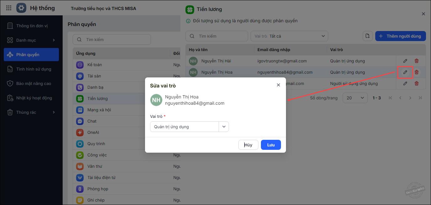 Khi cần sửa vai trò cho người dùng, trên danh sách người dùng ứng dụng, nhấn đúp chuột tại người dùng hoặc chọn vào biểu tượng Sửa. Chọn lại vai trò và nhấn Lưu.