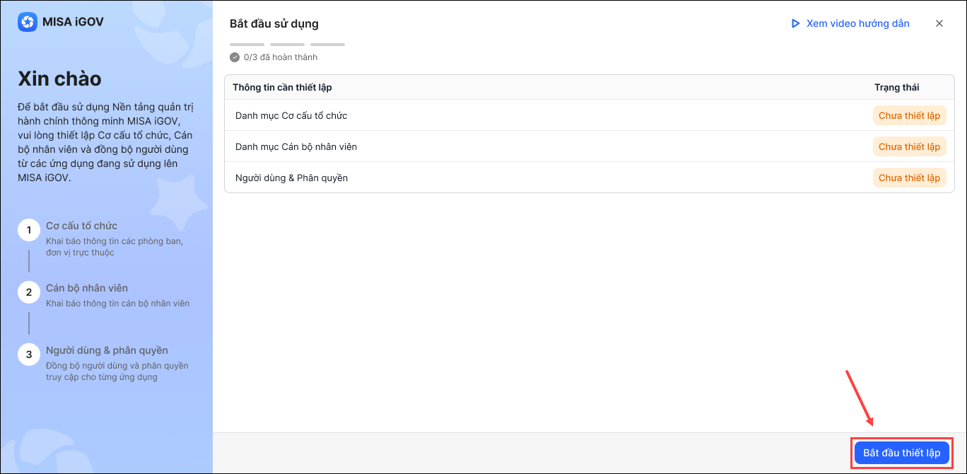 1. Khi anh/chị đăng nhập lần đầu vào nền tảng MISA iGOV, hệ thống hiển thị màn hình Bắt đầu sử dụng. Nhấn Bắt đầu thiết lập.