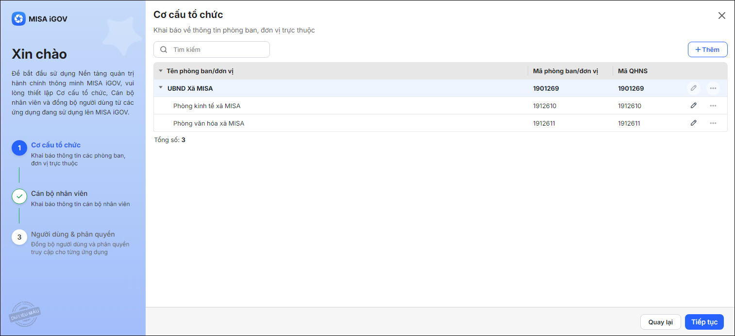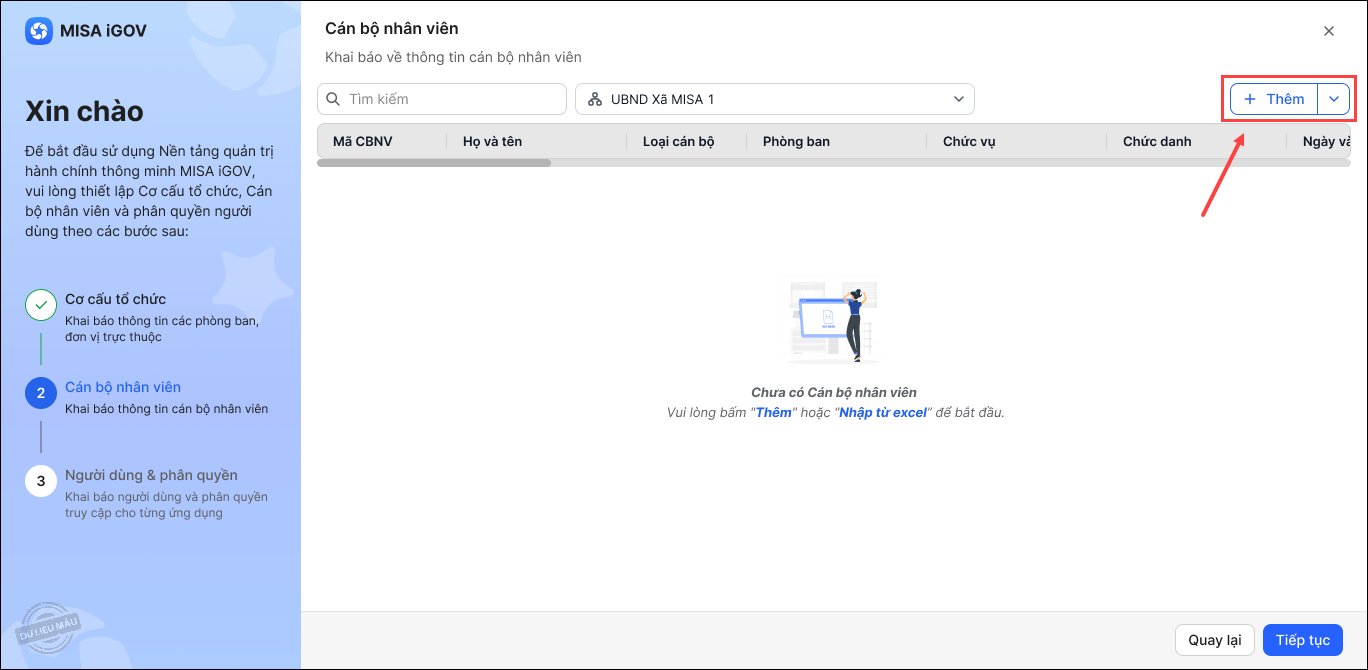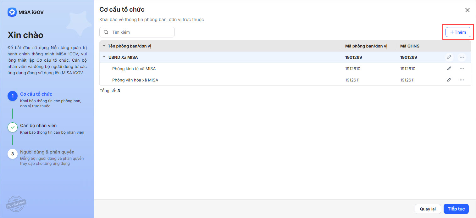 - Nếu không cần khai báo thêm phòng ban mới, có thể chuyển luôn sang bước tiếp theo bằng cách nhấn Tiếp tục.