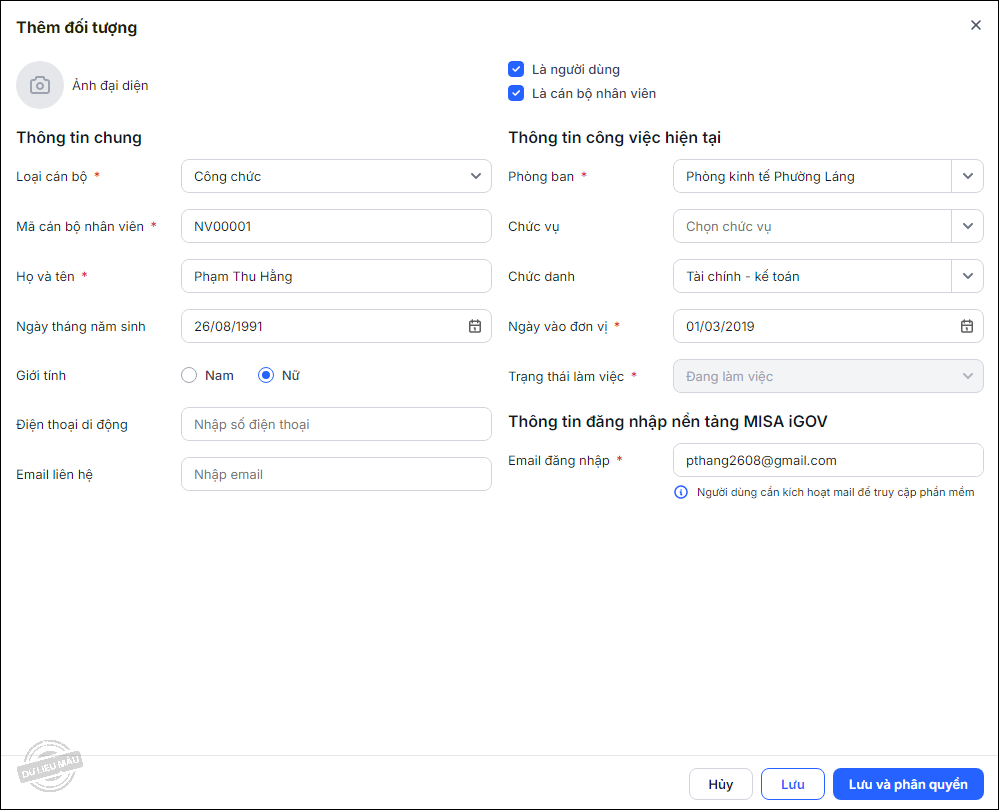 - Khai báo thông tin Loại cán bộ, Mã cán bộ nhân viên, Họ và tên, Phòng ban, Email đăng nhập…